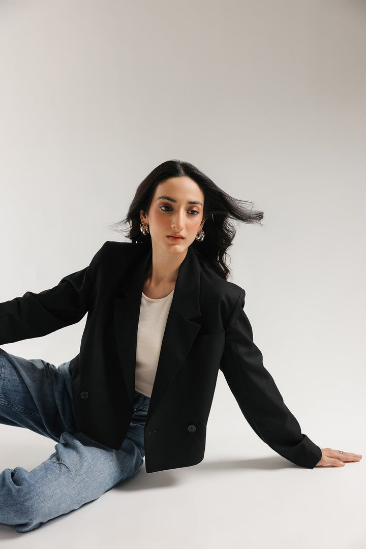 Own the contemporary chic look with this bold black cropped blazer. This modern take on a classic features a tailored, structured fit that hits perfectly at the waist for a flattering, fashion-forward silhouette. It maintains traditional elegance with classic lapels and a sleek double-breasted closure. The shorter length makes it an incredibly versatile layering piece, perfect for pairing with high-waisted trousers, skirts, or wide-leg denim for an instantly elevated, stylish ensemble.