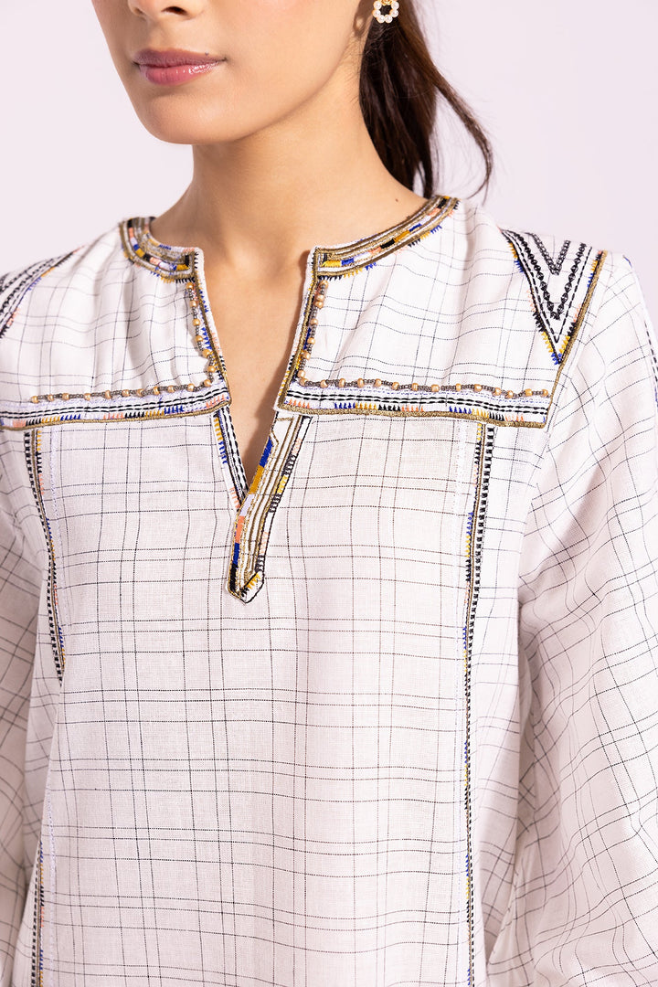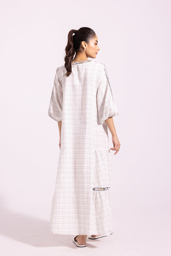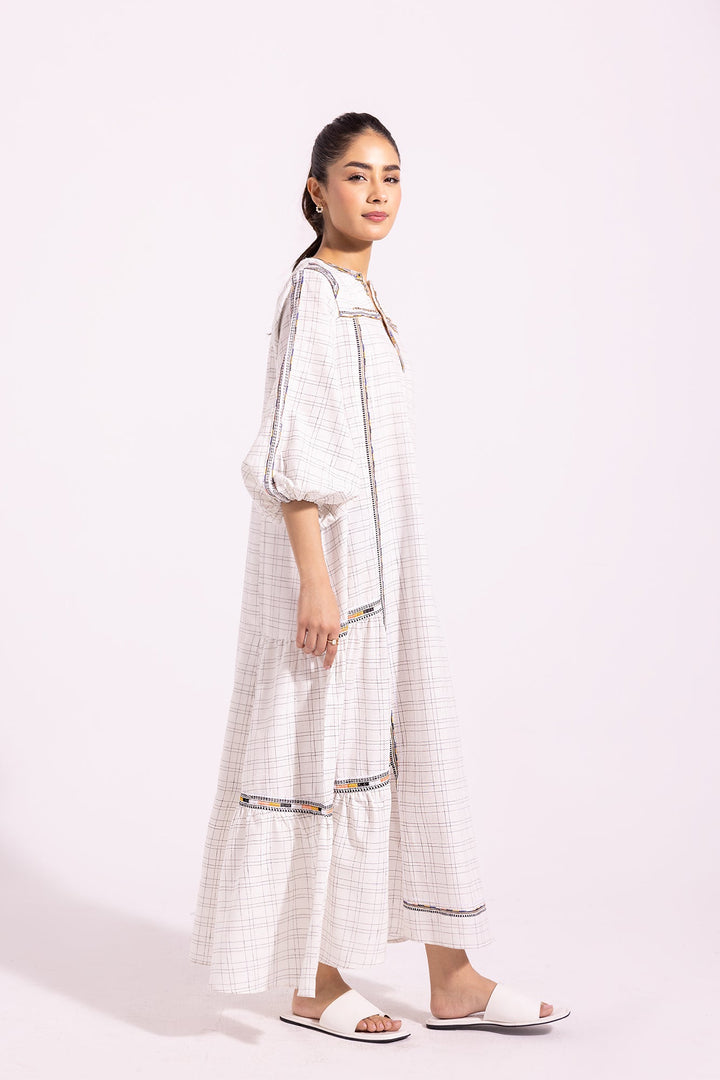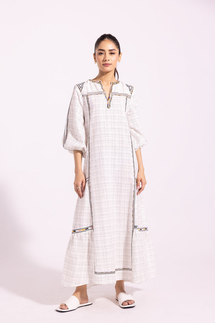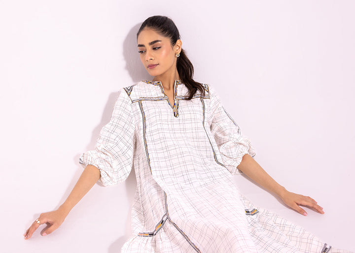 A gracefully elegant composition is layered over this contemporary dress rendered in a classy coconut milk shade and illustrating a checkered canvas. Crafted in an on-trend silhouette with gathers, this flowy dress is enriched with captivating pattern embroidered in vibrant hues. Style this classy dress at fun parties and be the epitome of grace this season.