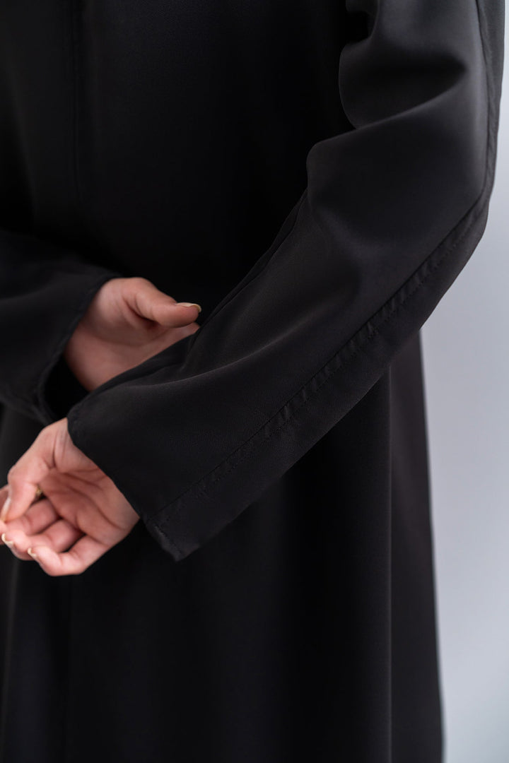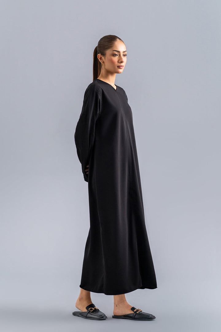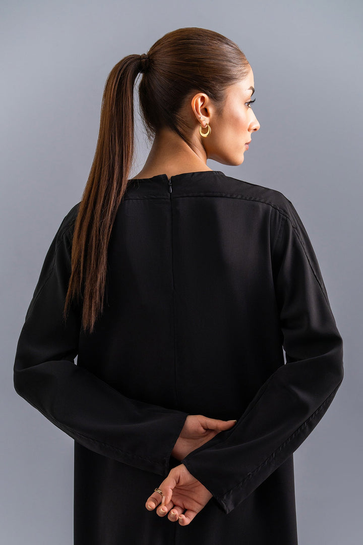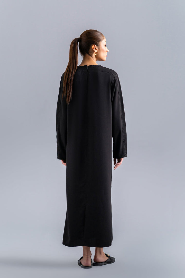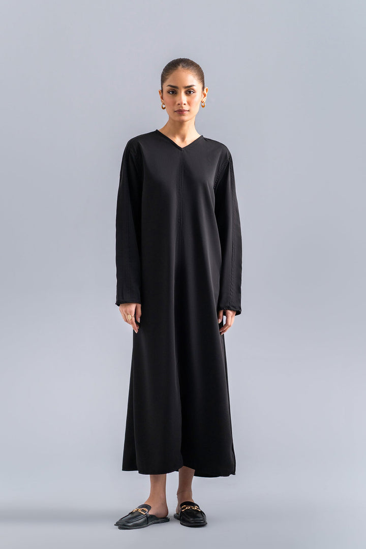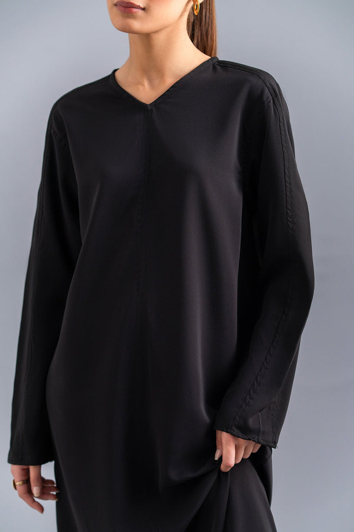 Make a style statement without the effort in this elegant, solid black dress. With its perfectly crafted v neck and elegantly flowing silhouette, it makes for a sleek look perfect for evening soirees. Crafted to perfection and enhanced with stitch details, you can't go wrong with this charming outfit.