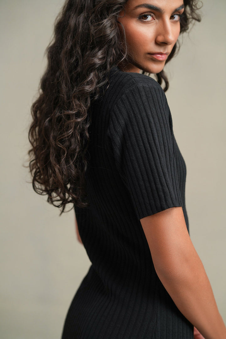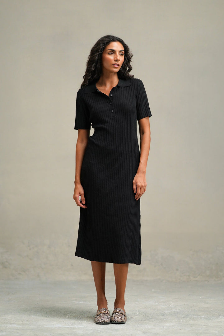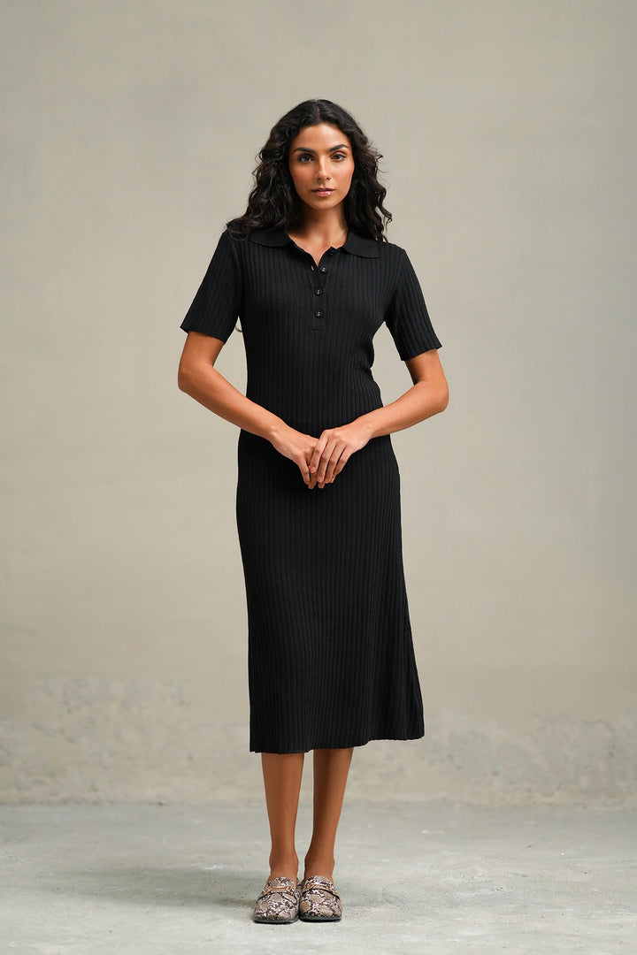 Look classy in this contemporary dress rendered in a charming black shade. Crafted in an on-trend fitted silhouette with collar neck and buttons at front, this gorgeous dress beautifully illustrates a ribbed canvas with an exquisite look. Style this statement dress at fun events this winter season.