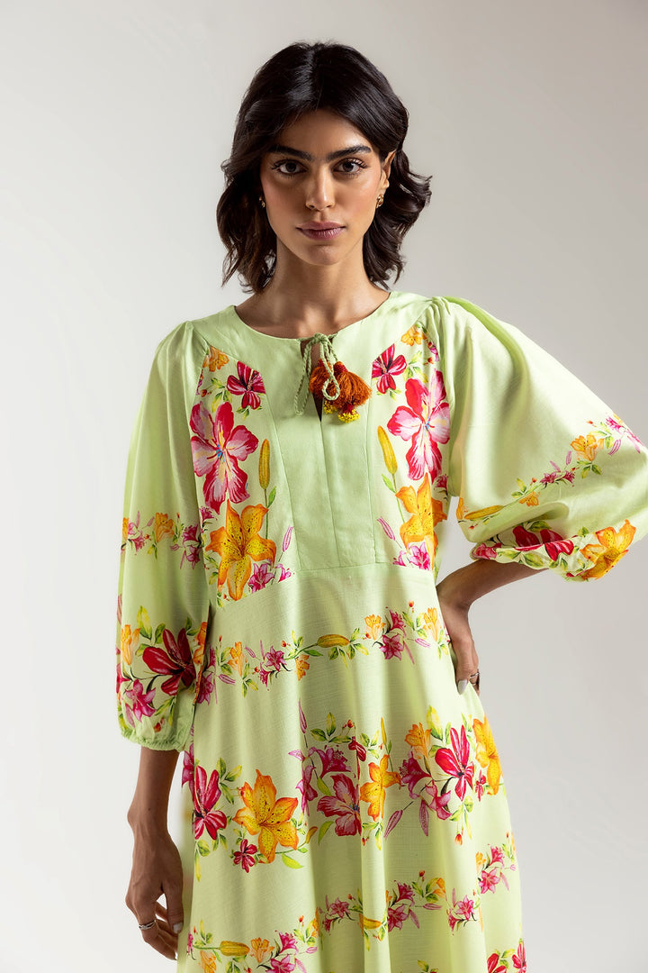 Expertly crafted with a contemporary silhouette and flared fit, this elegant luscious green dress is adorned with vibrant floral prints in mesmerizing colors illustrating a blooming canvas. Perfect for fun gatherings, it exudes a sassy and trendy vibe for the summer season.