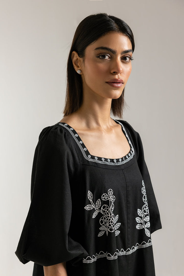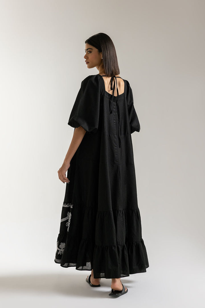 Embrace effortless bohemian charm with this striking black embroidered maxi dress. Crafted for a relaxed yet elegant silhouette, this flowing dress features a classic square neckline beautifully framed by delicate white embroidery. The loose-fitting sleeves and tiered skirt are adorned with intricate floral and abstract white embroidery, creating a captivating contrast against the deep black fabric. Perfect for casual gatherings or daytime events.