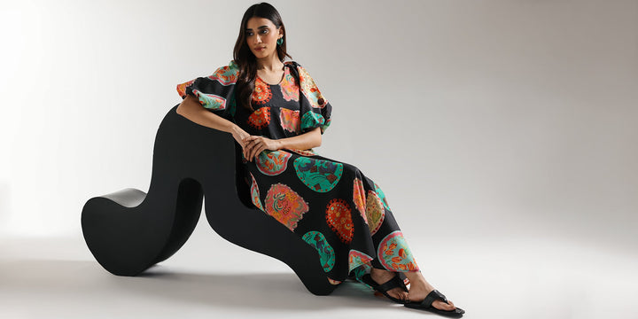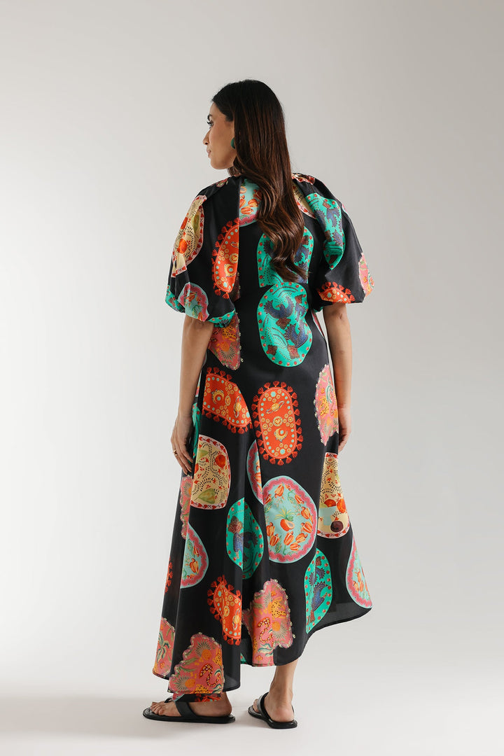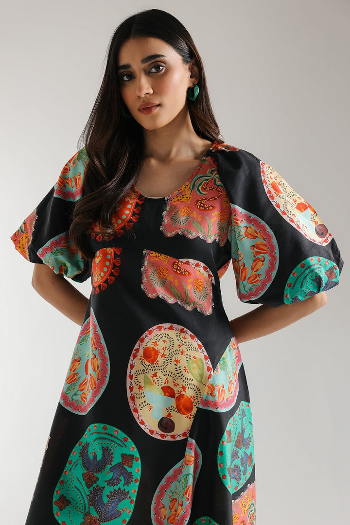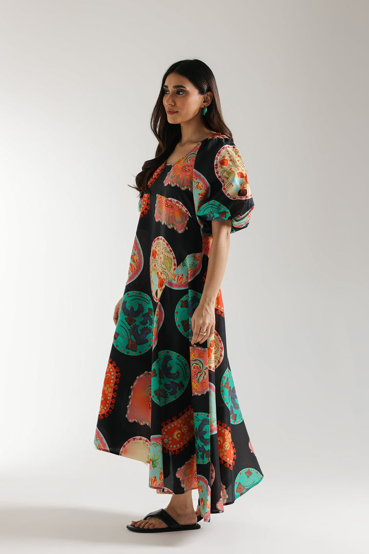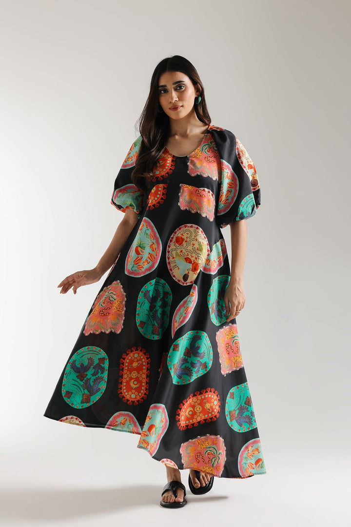 This elegant dress is the perfect addition to your summer wardrobe. With a modern twist on a classic style, the vibrant abstract prints and graceful black color will elevate your look. The flared fit below the waist and puffed sleeves provide a comfortable and chic look, making you stand out in both elegance and comfort.