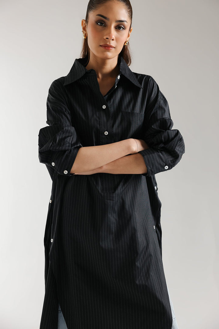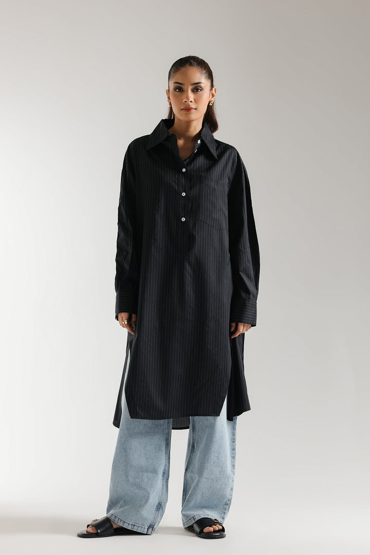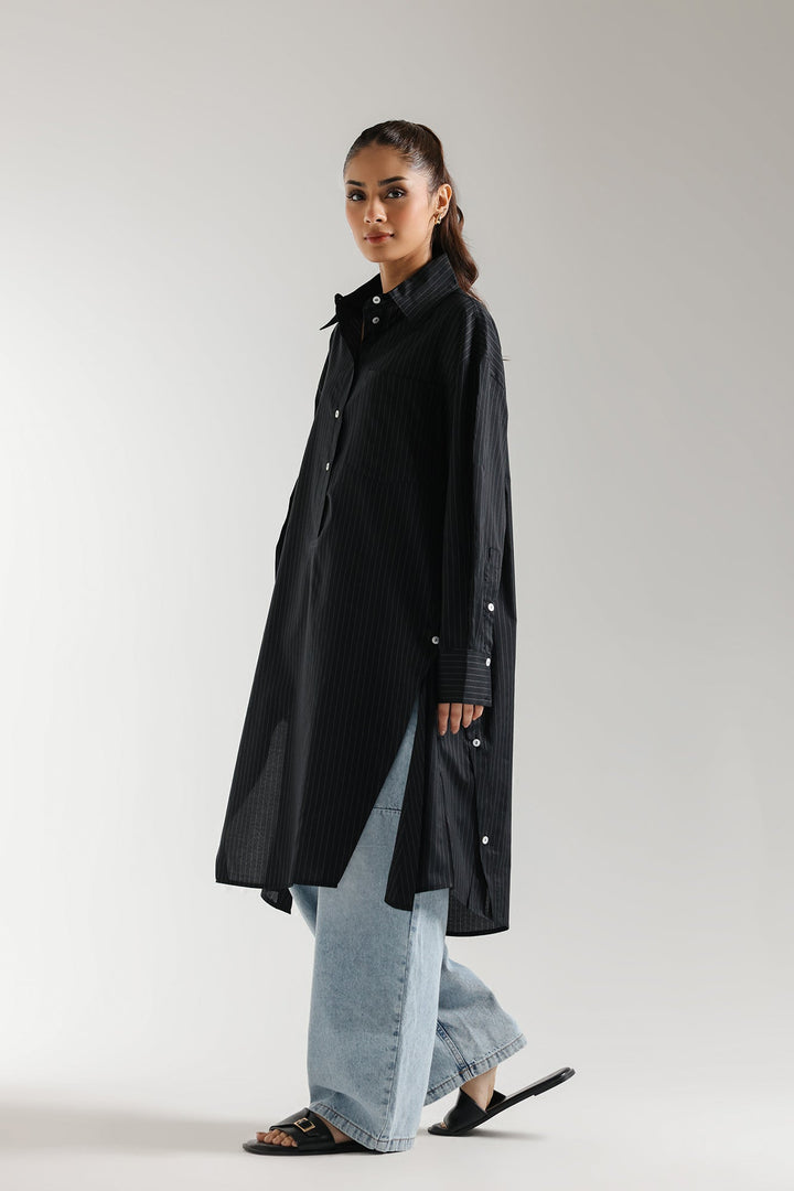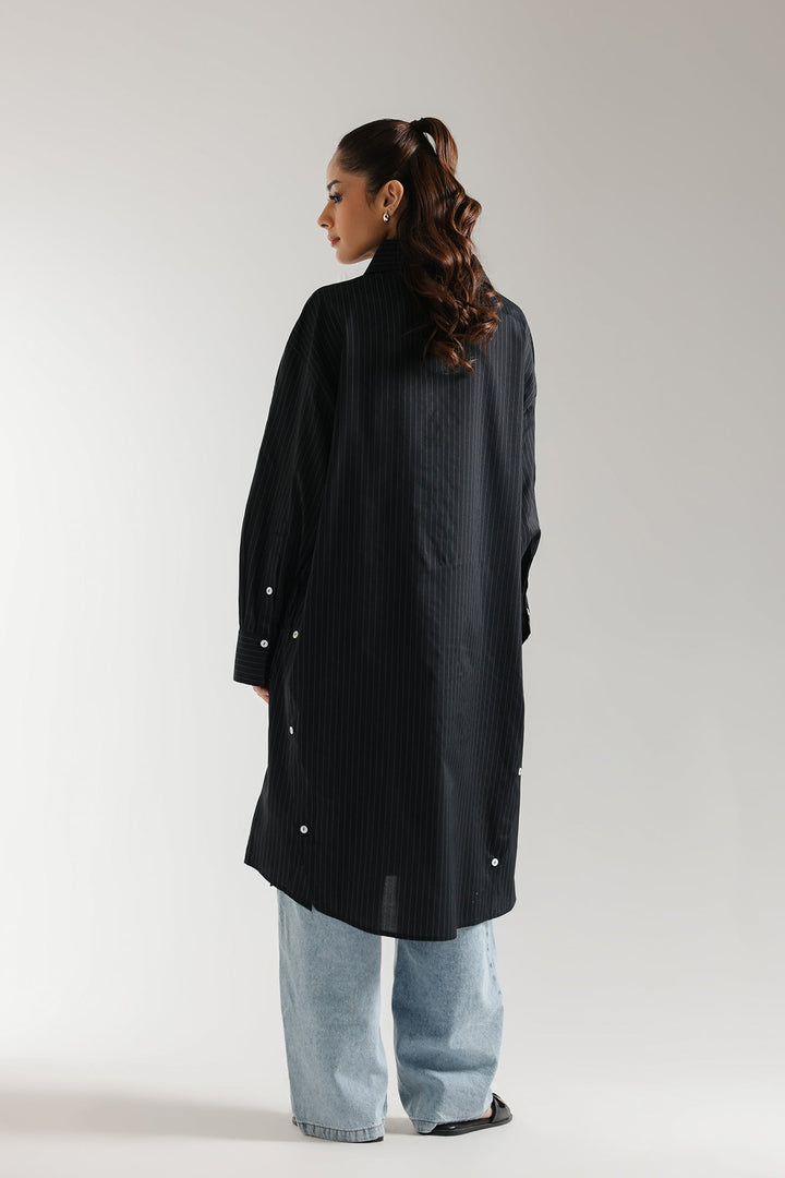 This contemporary dress boasts an elegant and sleek loose fit design, featuring collar neck with buttons at front placket and enriched with stripes layered on a deep black canvas. Its stunning silhouette with round hem and embellished with trendy buttons, style this statement dress at summer gatherings.