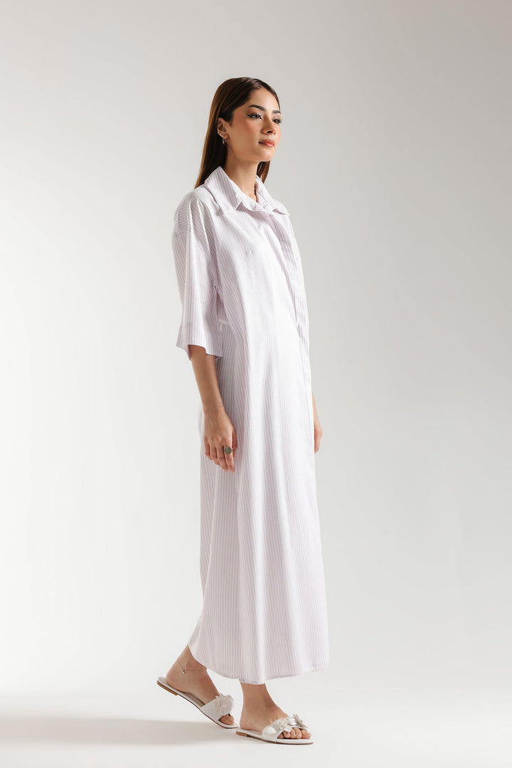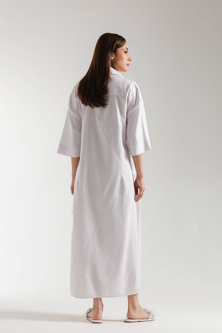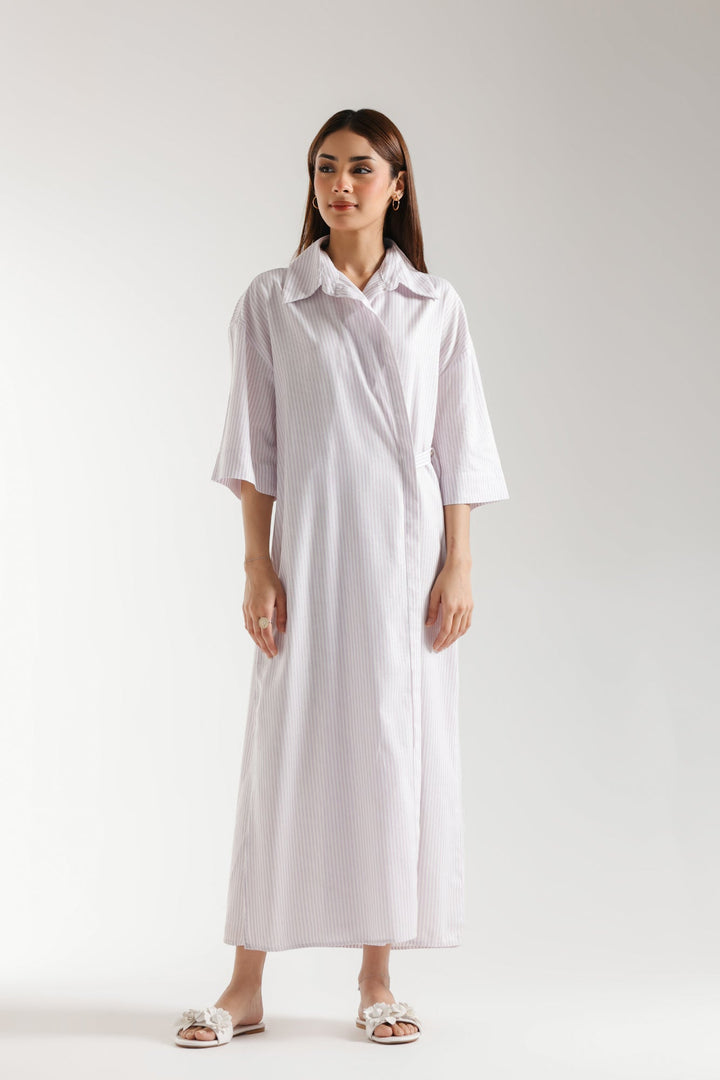 A gracefully elegant dress crafted in a contemporary straight fit with front open silhouette with overlapped belt closure. Illustrating a mesmerizing cream pink color and beautifully adorned with stripes. This contemporary yet sassy dress is a trendy option for fun gatherings this summer season.