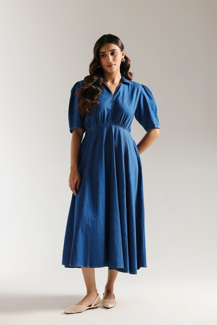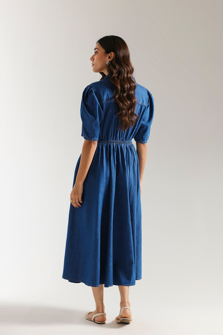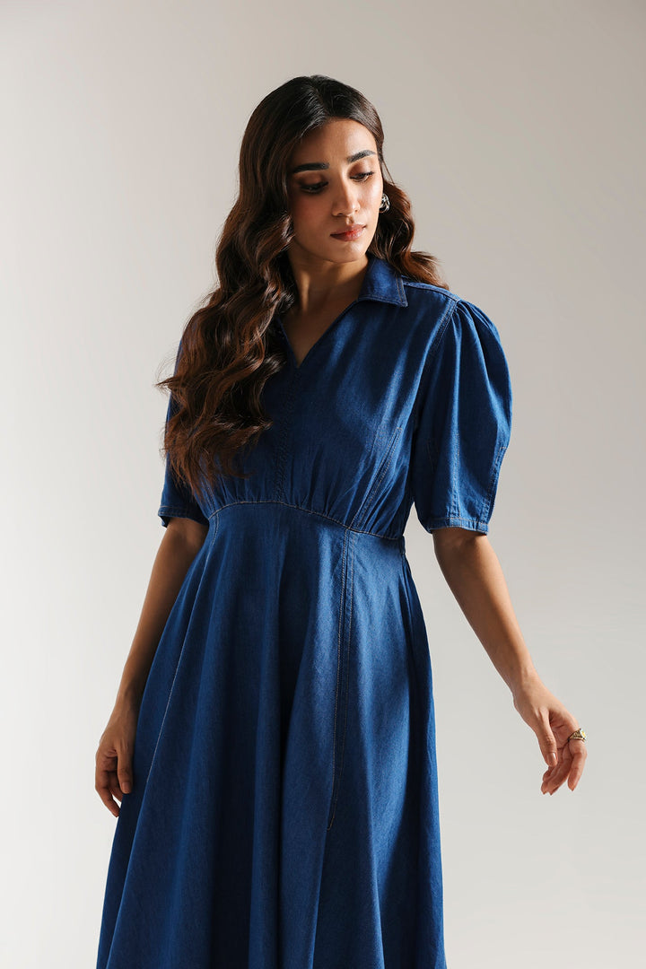 This effortlessly stylish dress offers a modern twist on a timeless classic. The rich dark blue fabric drapes beautifully, while the charming puff sleeves and a cinched waist create a flattering and elegant silhouette. With its versatile design, this dress is perfect for any occasion where you want to look chic and feel comfortable.