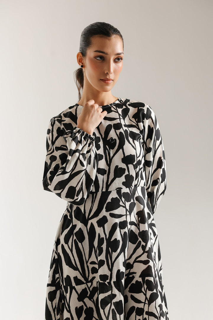 Command attention in this breathtaking maxi dress, a perfect fusion of bold artistry and dramatic silhouette. The flowing, full-length dress features a striking black all-over print with organic, stylized floral and botanical motifs that create a captivating visual effect against the off-white base. The design is elevated by a simple round neckline and voluminous, billowy sleeves that cinch at the wrists, adding an element of contemporary drama. With a comfortable fit that flows gracefully to the floor, this dress is an artistic statement piece perfect for a sophisticated, modern look.