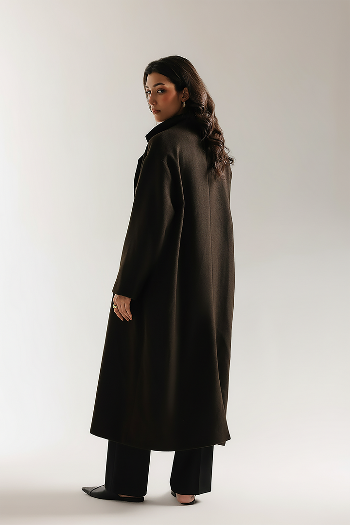 Wrap yourself in sophisticated warmth with this luxurious dark olive long coat. The design features an oversized, relaxed fit and a generous length that falls well past the knee, providing both style and coverage. It is defined by wide, classic lapels and a simple double-breasted button closure. Crafted in a rich, textured fabric, this coat is the quintessential piece for a dramatic, effortlessly chic silhouette during the cooler months.