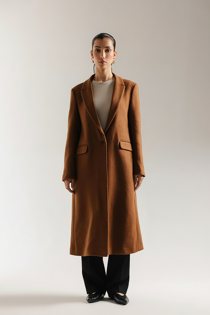 Channel effortless power and polish with this refined long coat in a rich, warm camel brown. This single-breasted coat features a long, tailored silhouette that grazes the calf, defined by sharp lapels and structured shoulders for a clean, sophisticated line. Crafted in a smooth, high-quality fabric, this timeless piece transitions seamlessly from work to weekend, offering an instantly elevated, classic look.