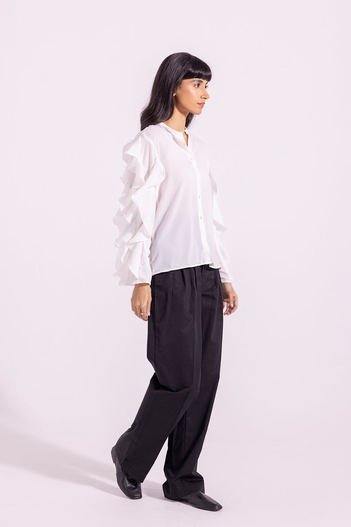 Look classy yet sassy this season in this elegant design portrayed on this chic button down shirt rendered in an appealing off white shade. Crafted in a contemporary silhouette with frills at sleeves, this trendy solid shirt is a great option for fun gatherings.