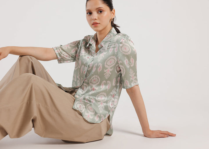 A trendy outfit and a graceful, elegant addition to your wardrobe that will instantly add a contemporary touch. The luscious apple green shirt is highlighted by captivating pattern printed in vibrant shades, making it perfect for this party season. Enjoy a gorgeous look and stylish feel with this design.