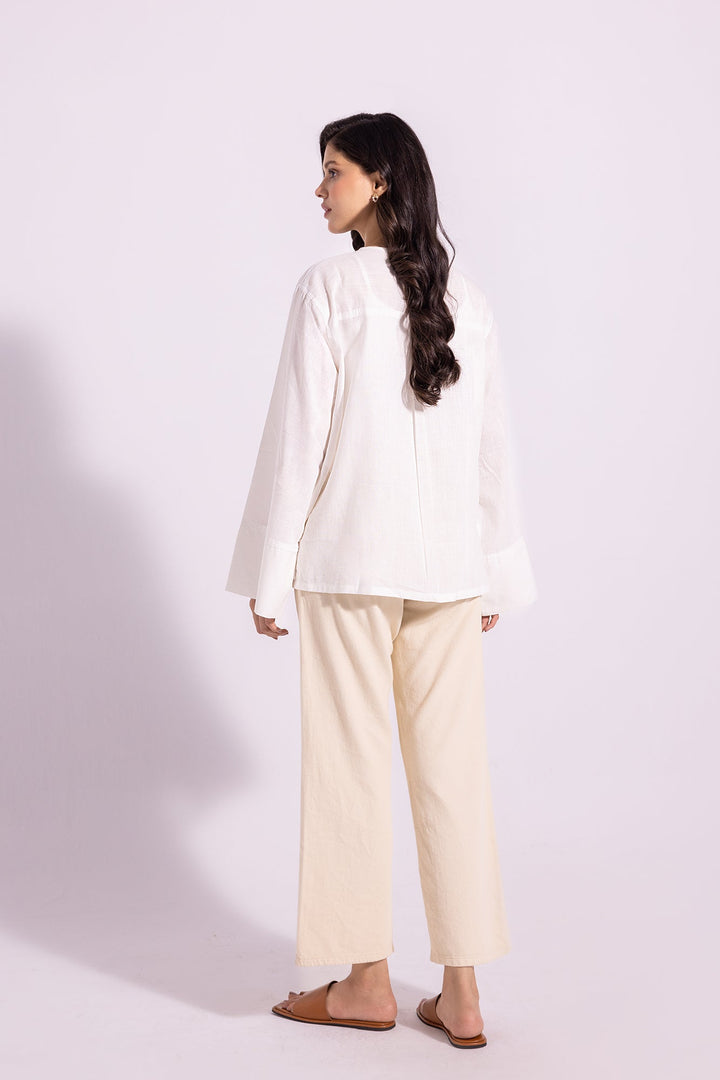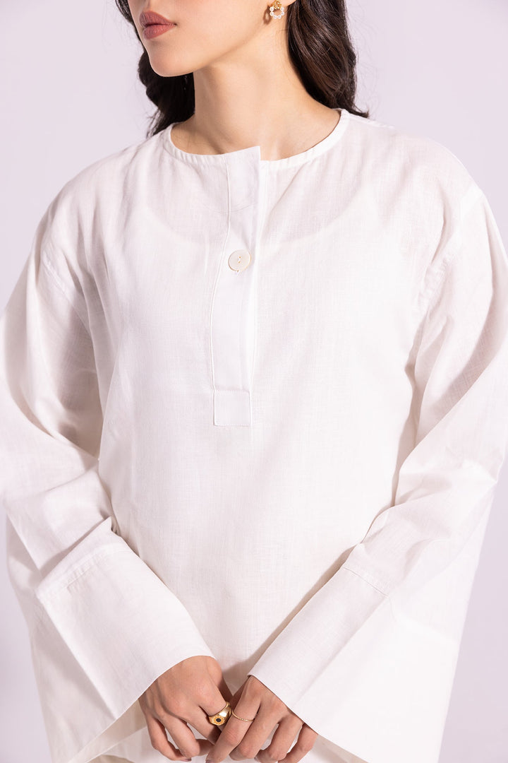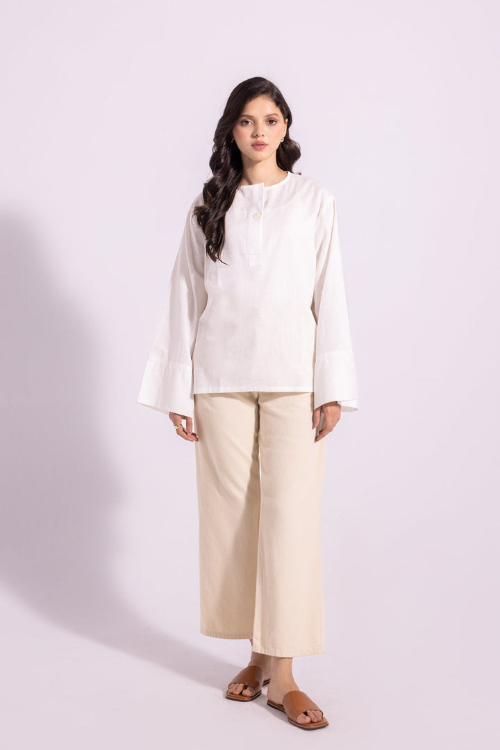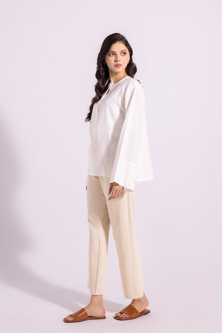 A chic and trendy design is portrayed on this classy shirt rendered in a creamy off white shade. Crafted in a contemporary silhouette with round neck illustrating a minimalistic approach, this trendy solid top is a great option for fun gatherings.