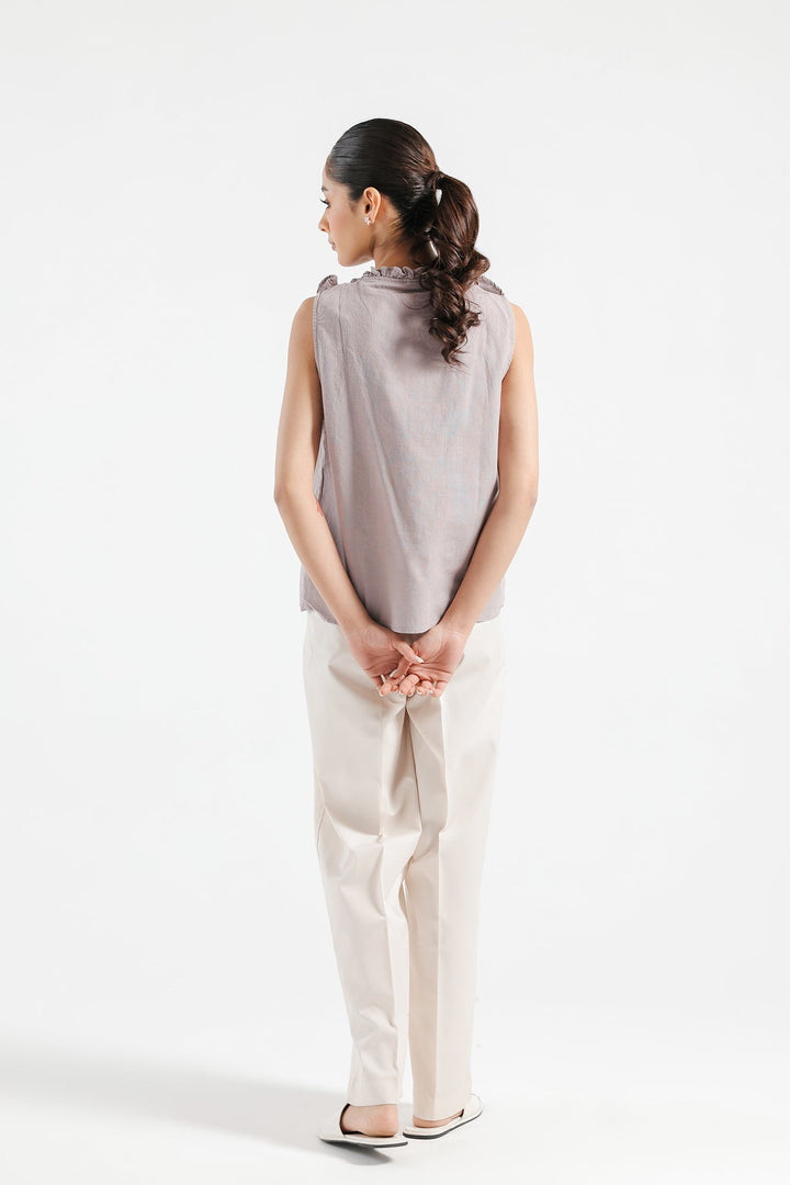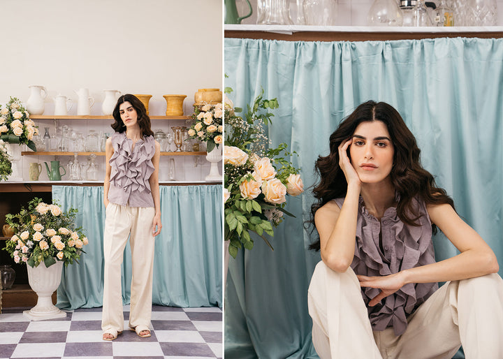 This western-style, sleeveless button down shirt is perfect for the summer season. With elegant frills at the front and lilac mist color, it adds a touch of sophistication to any outfit. Stay cool and stylish with this must-have piece for the party season ahead.