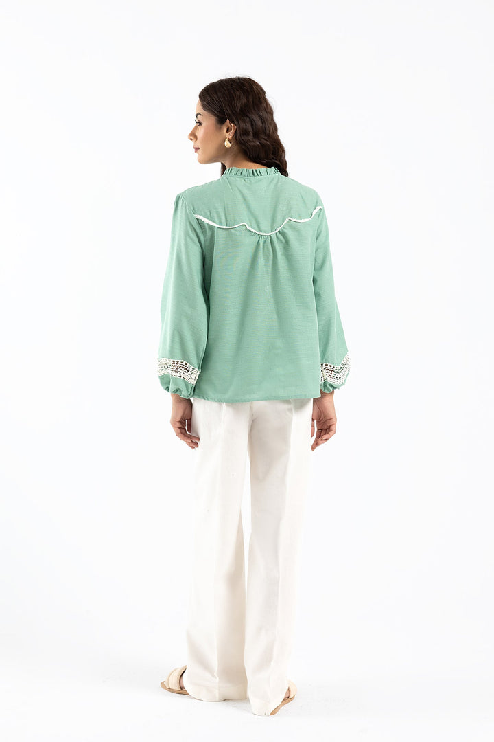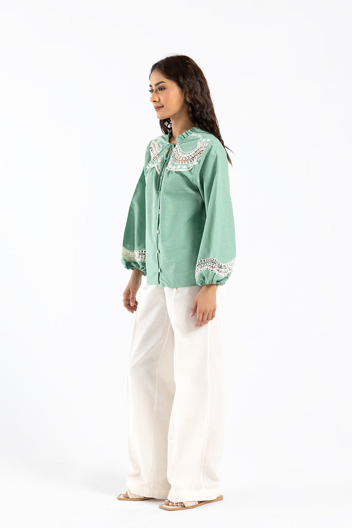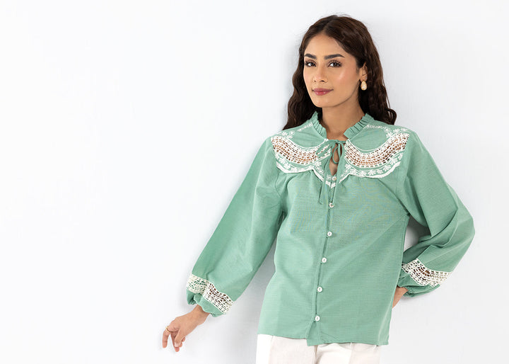 An aesthetically rich composition is portrayed on this trendy shirt rendered in an appealing sea green color. Crafted in a chic button silhouette, the elegant top is enriched with intricate embroidery with cutwork details portrayed in contrasted white hues. This contemporary top is a perfect option to style at fun occasions this season.