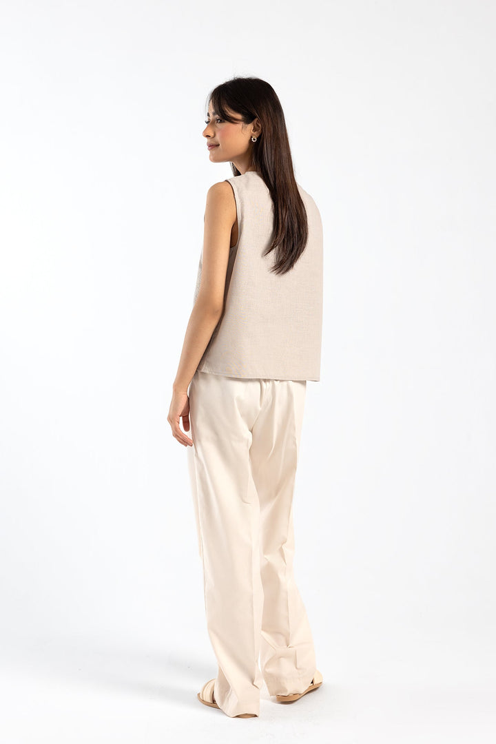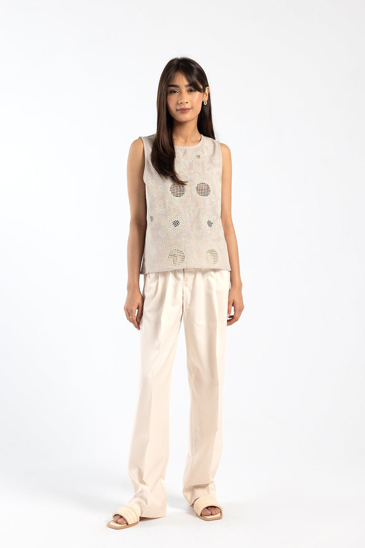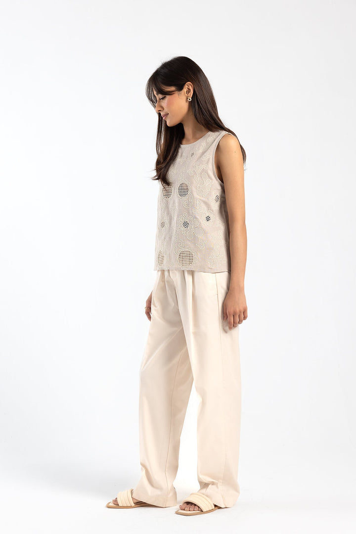 Experience the timeless elegance in this classy sleeveless top rendered in a subtle beige color. Adorned with intricate embroidery at front portraying floral design with cutwork details,, this beautiful top is a perfect option for happening events.