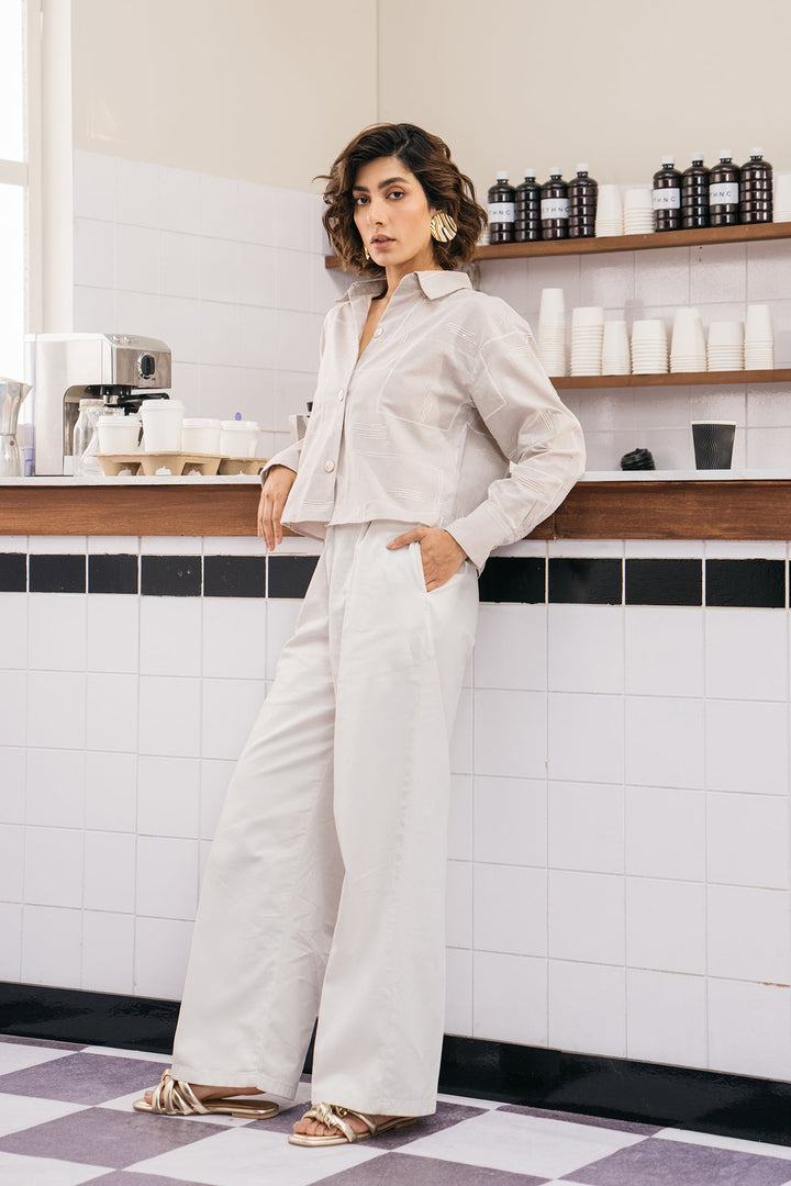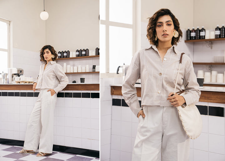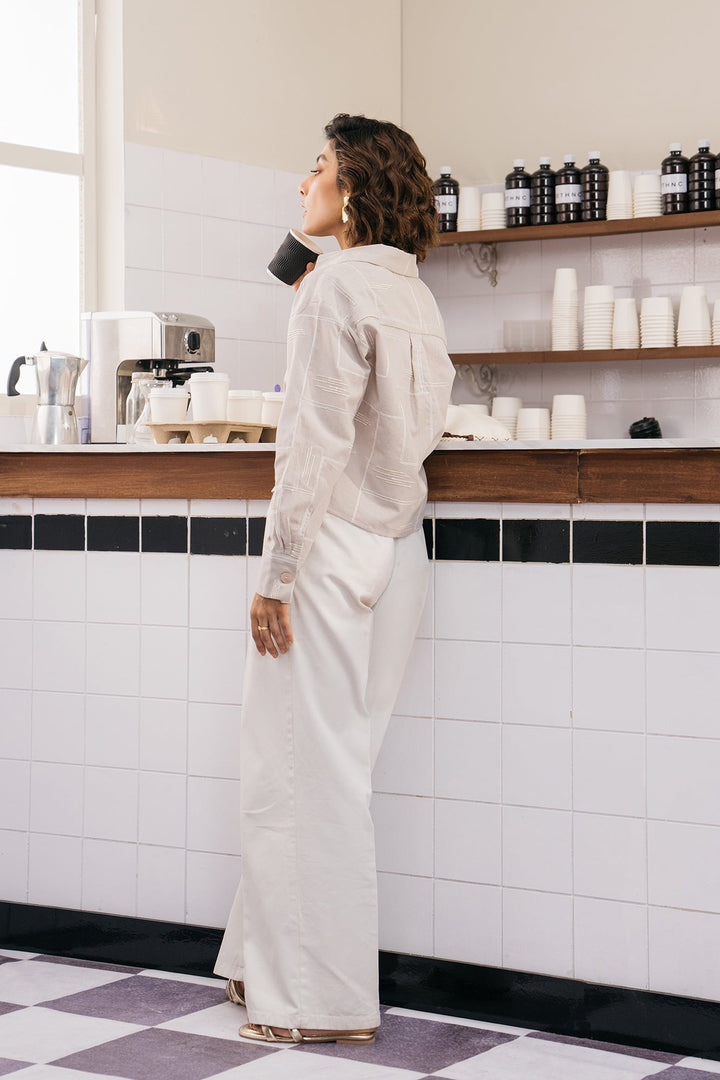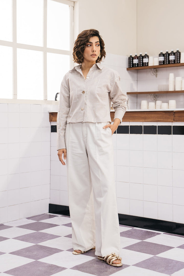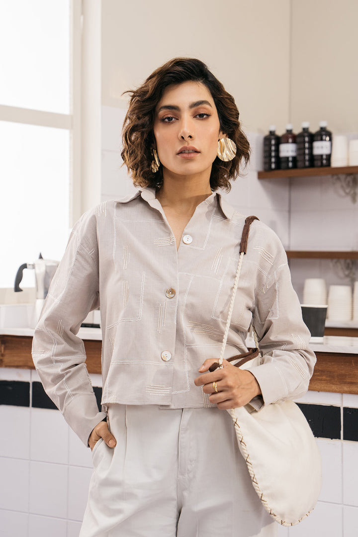 An enchanting composition is portrayed on this trendy top rendered in a subtle yellow beige color. Crafted in a chic button down silhouette with cuffs at sleeves opening and collar neck. The trendy top is enriched with intricate embroidery with abstract line designs. This contemporary top is a perfect option to style at fun occasions this season.