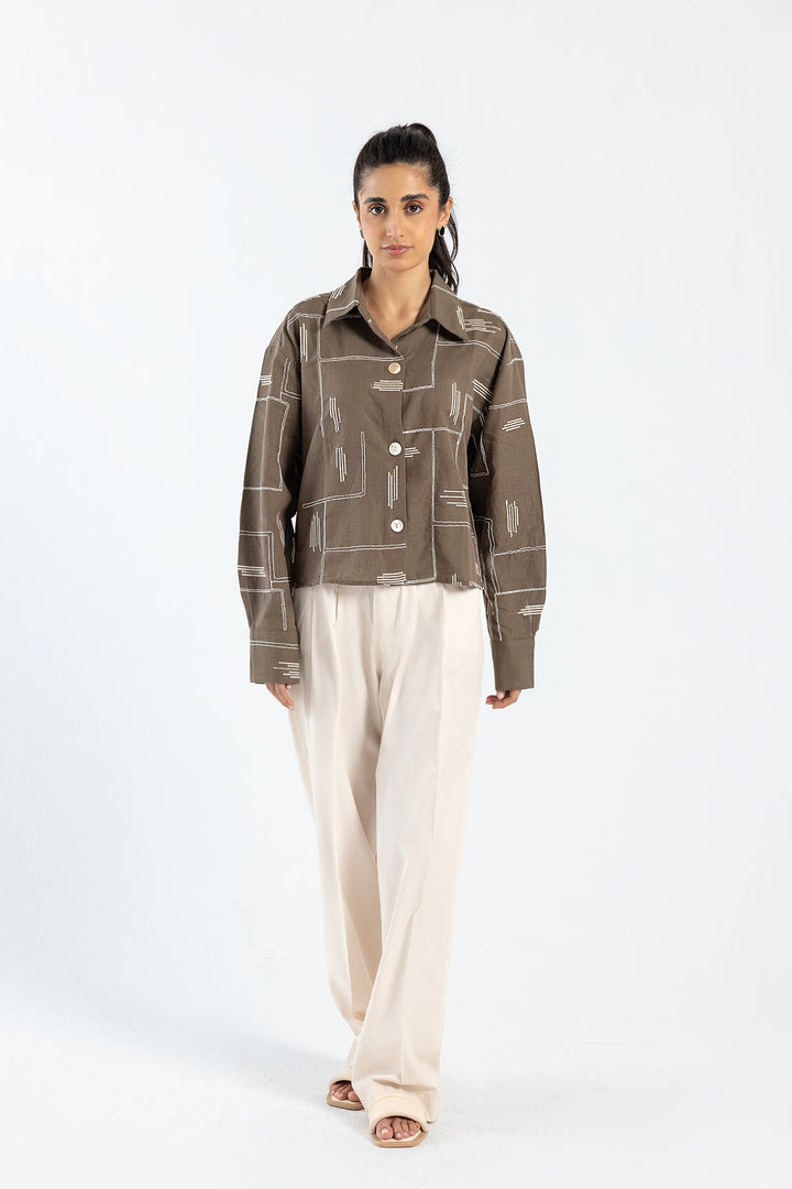 An enchanting composition is portrayed on this trendy top rendered in a deep olive color. Crafted in a chic button down silhouette with cuffs at sleeves opening and collar neck. The trendy top is enriched with intricate embroidery with abstract line designs. This contemporary top is a perfect option to style at fun occasions this season.