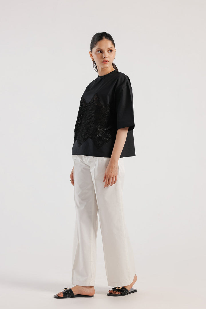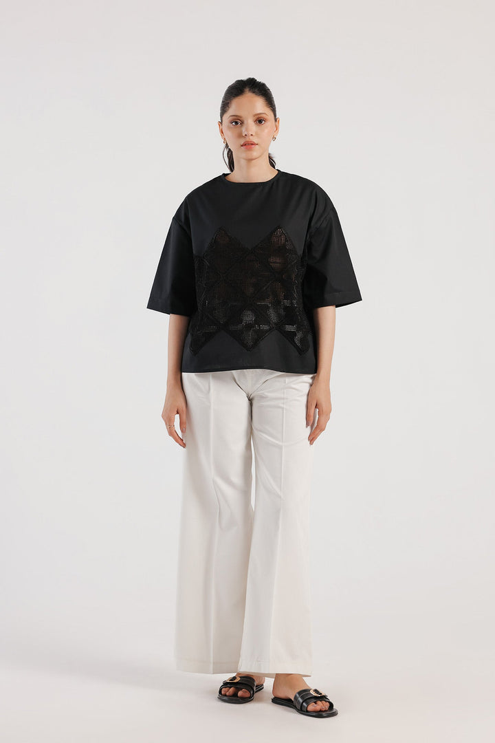 Experience the timeless elegance in this classy top rendered in a deep black color. Adorned with intricate embroidery at front portraying floral design with cutwork details,, this beautiful top is a perfect option for happening events.