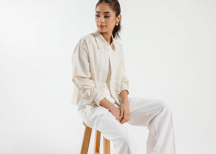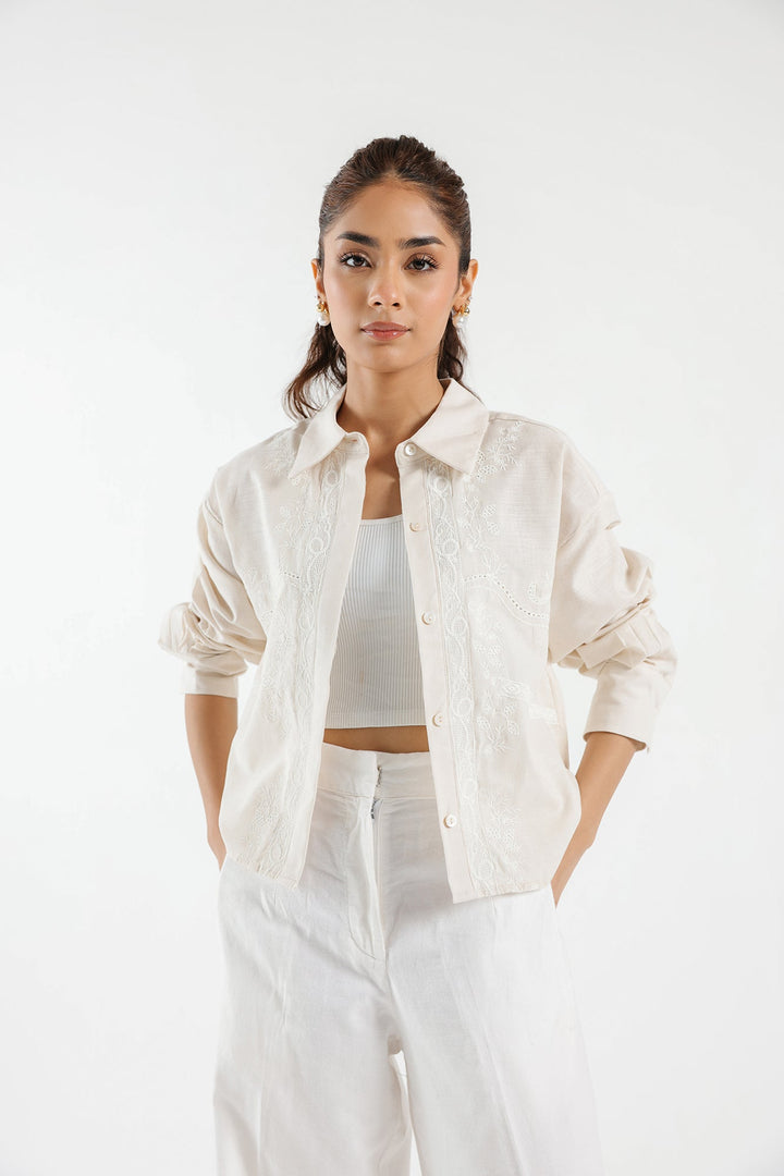 Experience the timeless elegance in this classy button down shirt rendered in a creamy off white color. Crafted in a trendy cropped silhouette and adorned with intricate embroidery illustrating floral designs, this beautiful shirt is a perfect option for happening events.