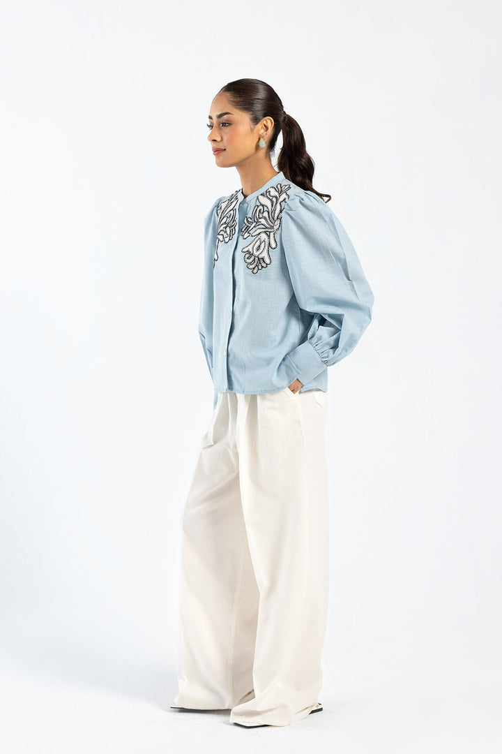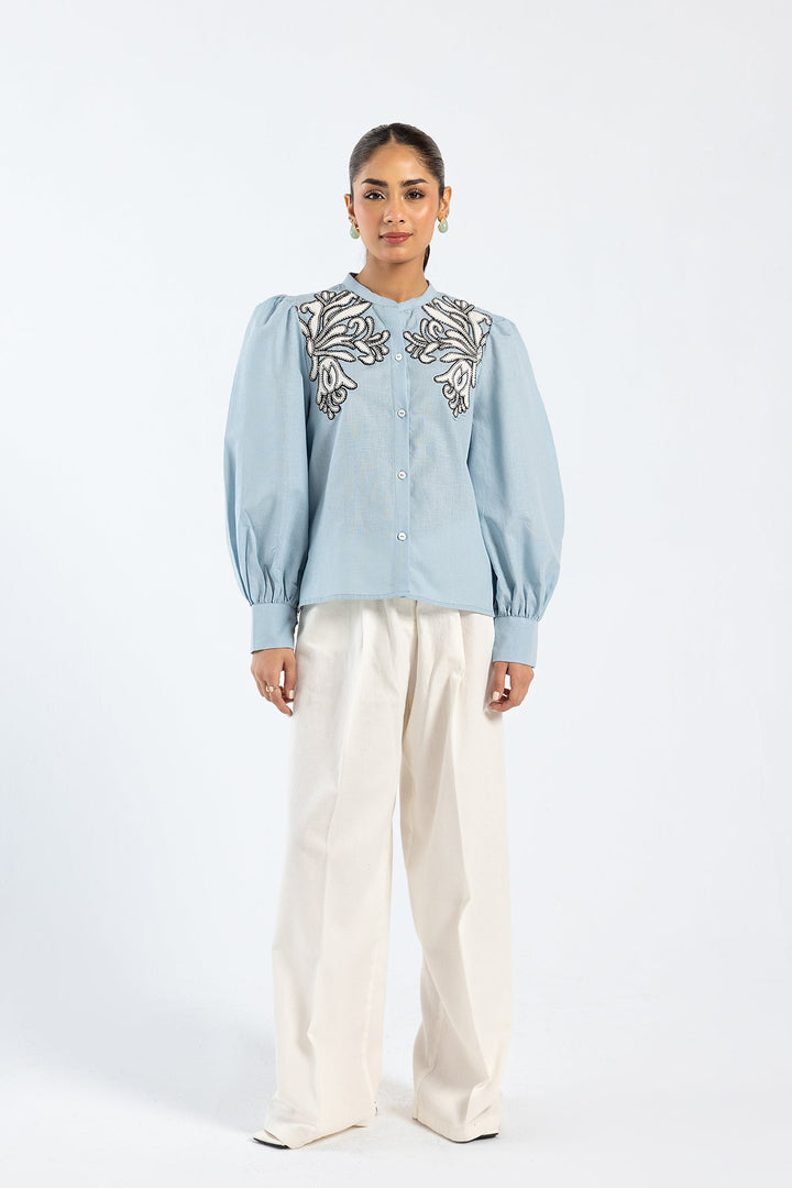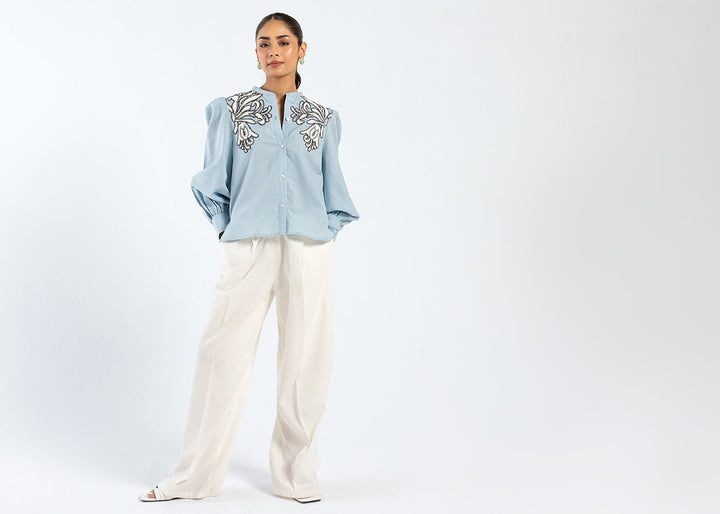 An enchanting composition is portrayed on this trendy top rendered in a refreshing light aqua color. Crafted in a chic button down silhouette with cuffs at sleeves opening, the trendy top is enriched with intricate embroidery with abstract floral designs. This contemporary top is a perfect option to style at fun occasions this season.