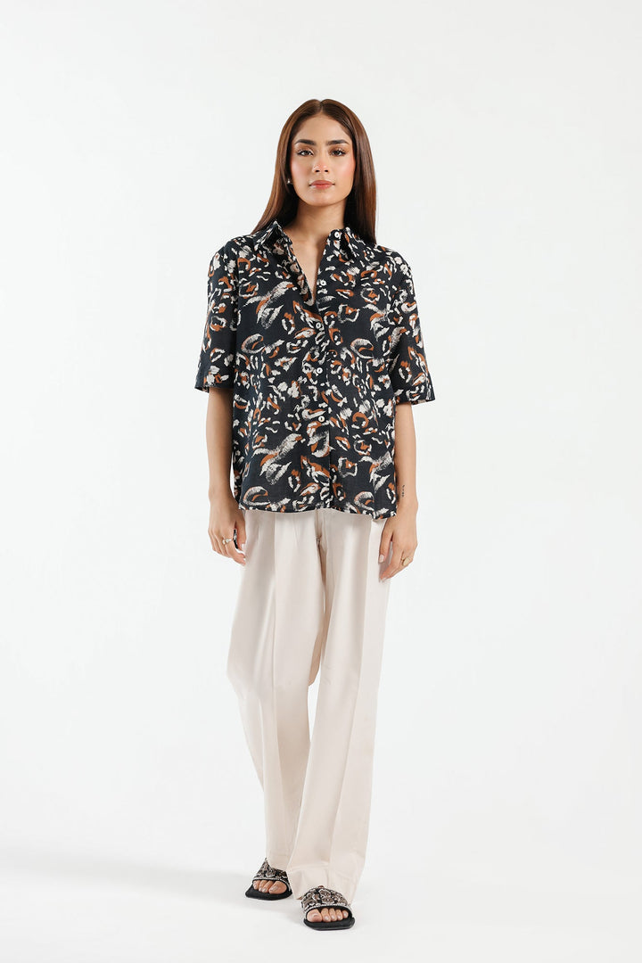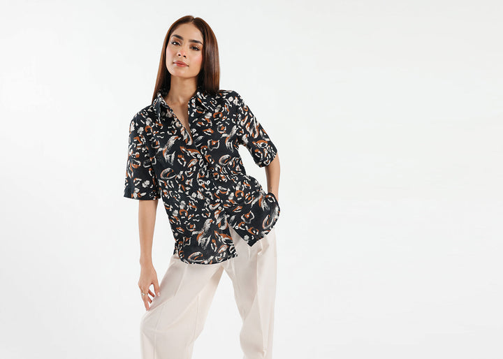 A chic and trendy design is portrayed on this contemporary button down shirt illustrated in a deep black shade. Enriched with aesthetically rich artistic prints portrayed in vibrant orange, mustard and ivory white color, this elegant shirt is a must have to embrace the sassy look this happening season.