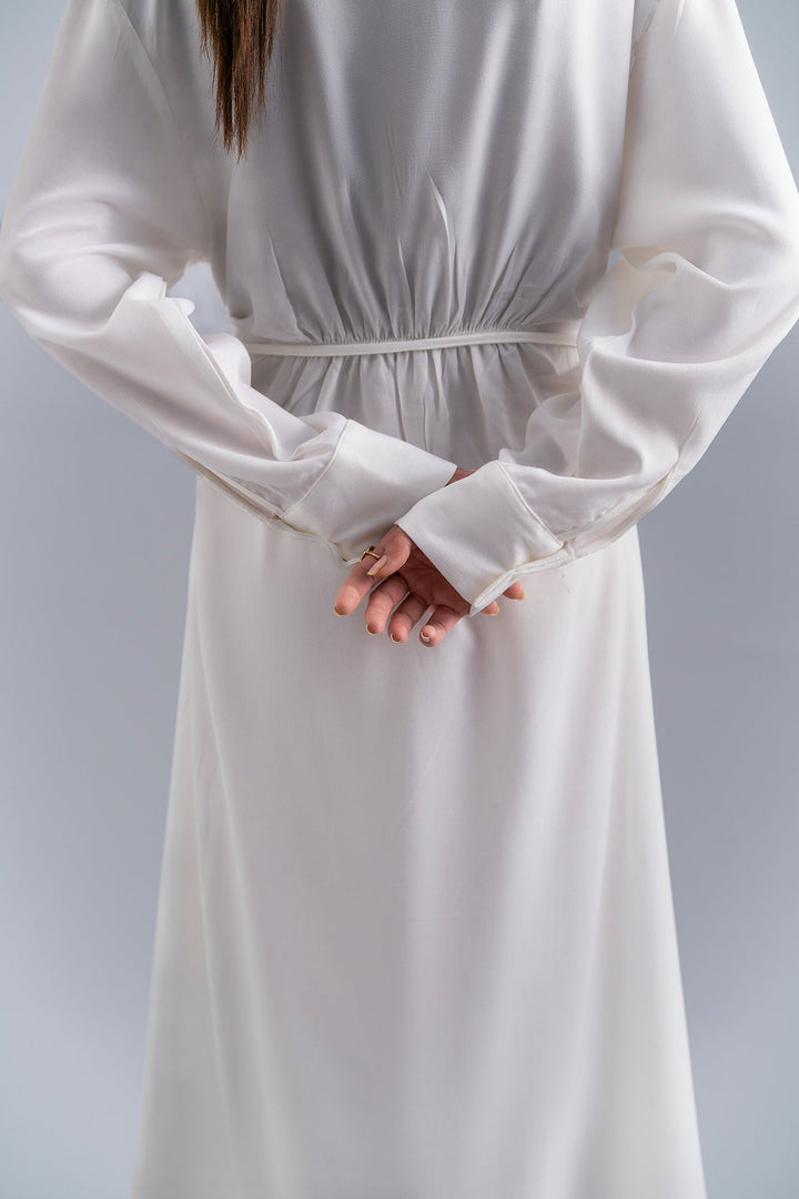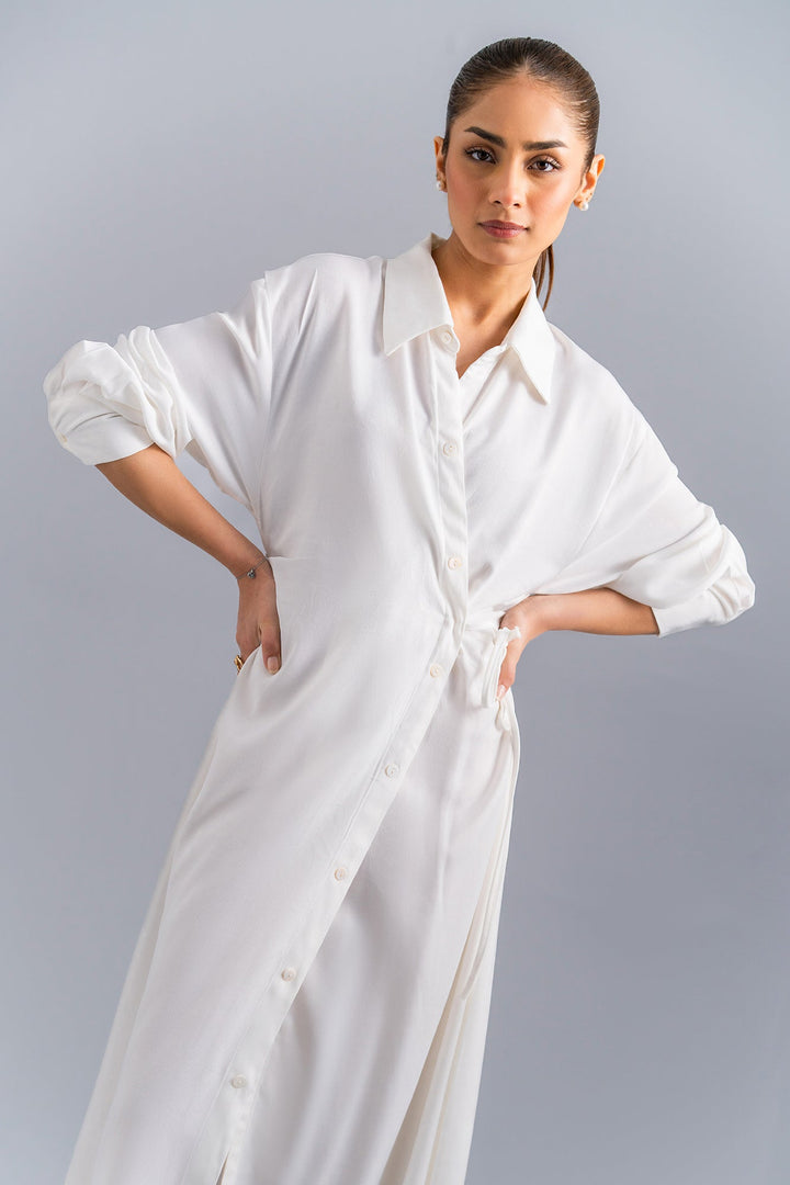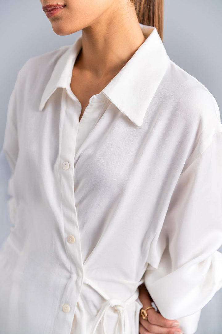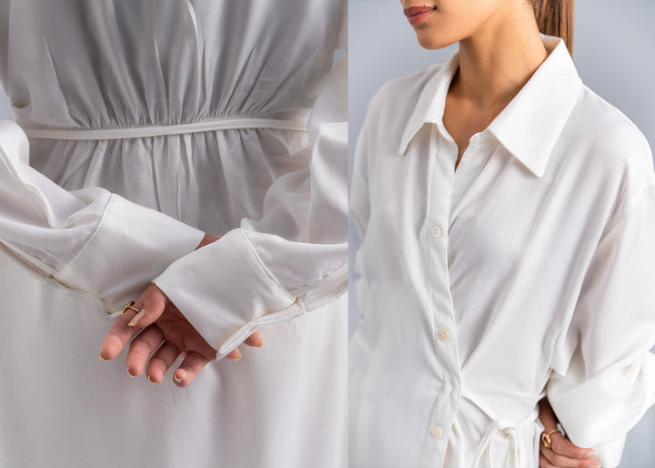 This graceful dress is the perfect statement piece for any fun event. Crafted in a trendy button down silhouette with a drawstring knot tie side waist. Rendered in a creamy off white color illustrating a contemporary look .Wear it at day events this season and it's a must-have for any fashionista.
