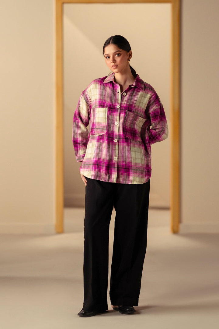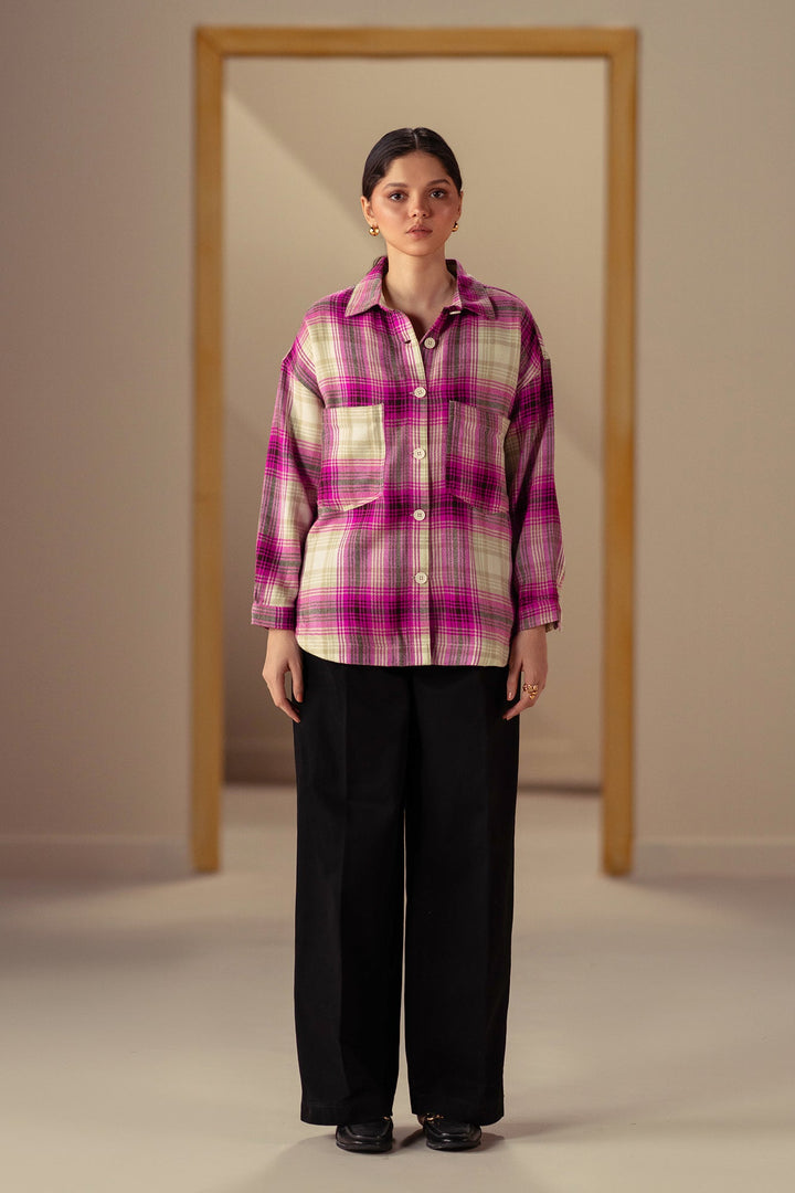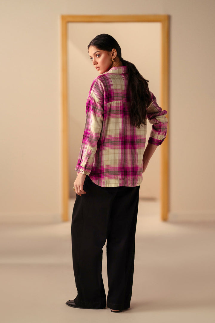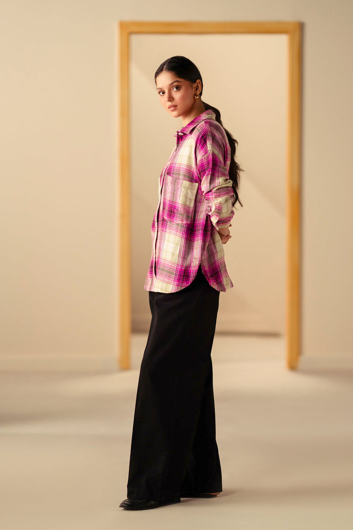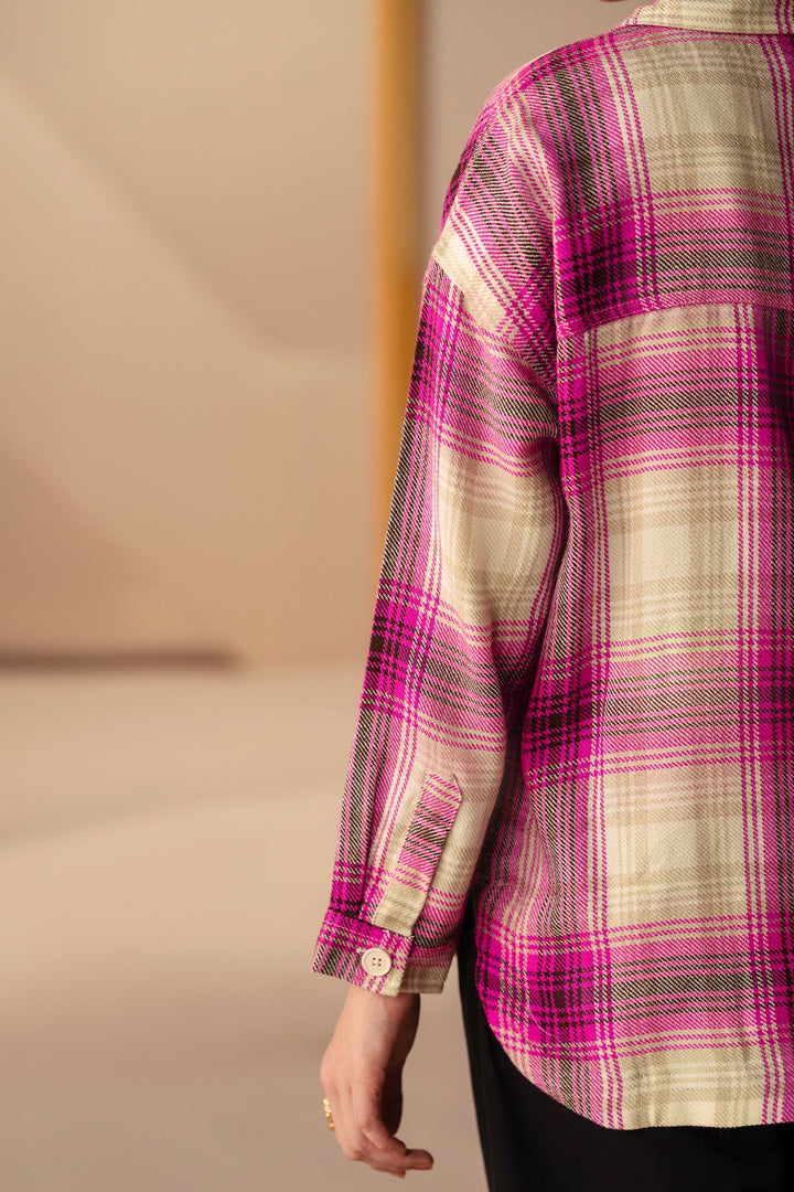 This contemporary shirt is perfect for making an attractive statement. It features a graceful, vibrant pink fluorescent canvas adorned with captivating checkered pattern printed in deep black and white tones. This trendy button down shirt is sure to add a touch of elegance to any wardrobe this winter season.