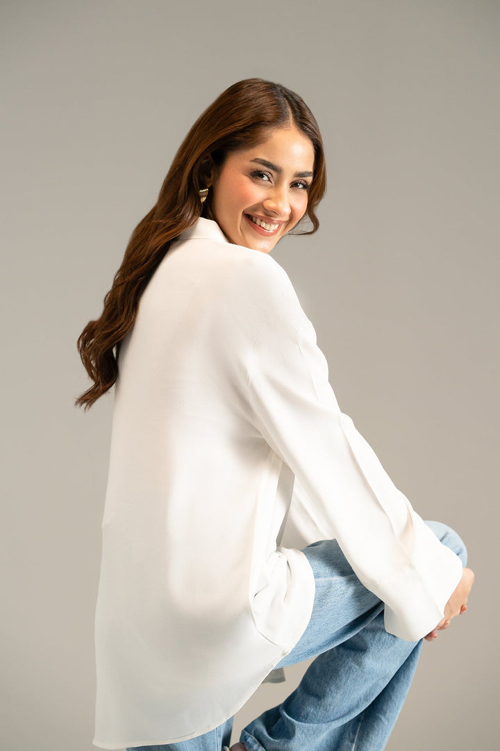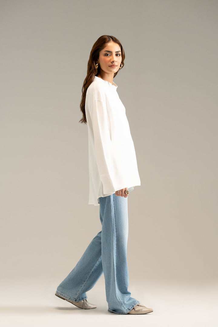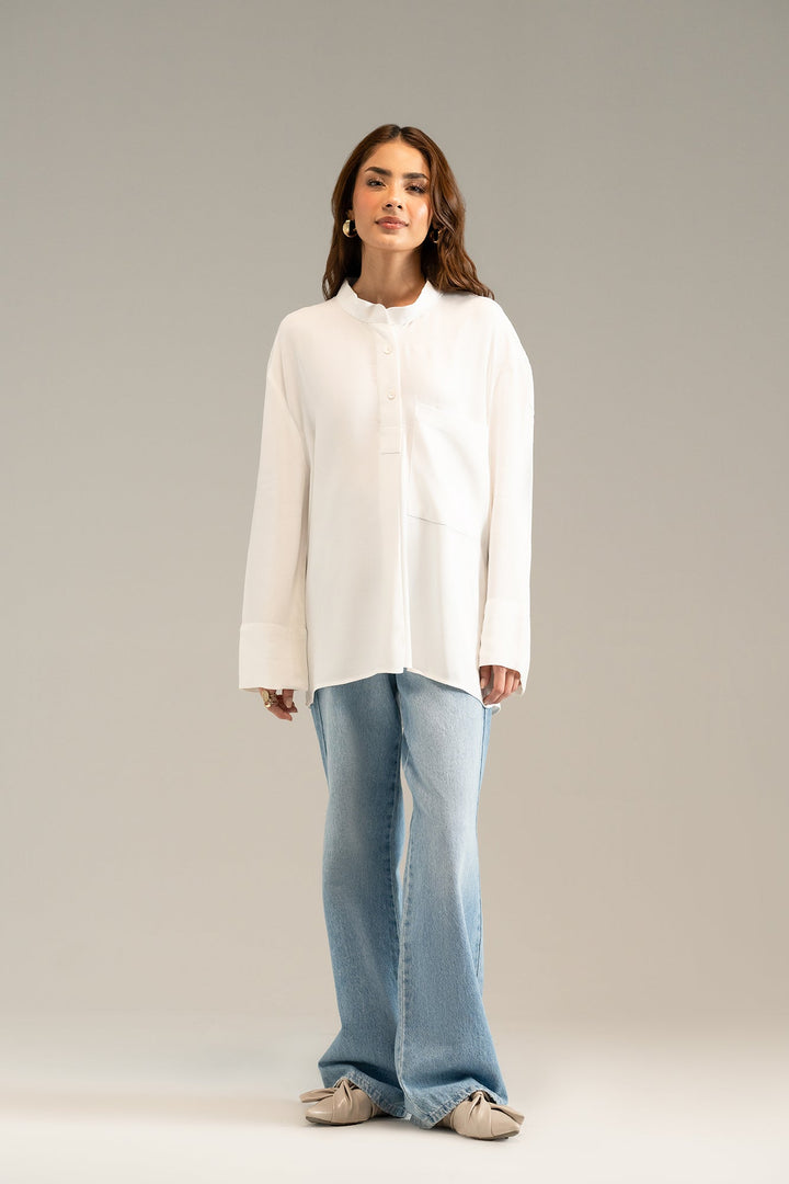 A classy white top with a trendy ban collar neck and adorned with buttons at placket and pocket. The elegant top has long flared sleeves, giving it a slightly oversized, flowy appearance. Creating a minimalist, sophisticated look to style this season.