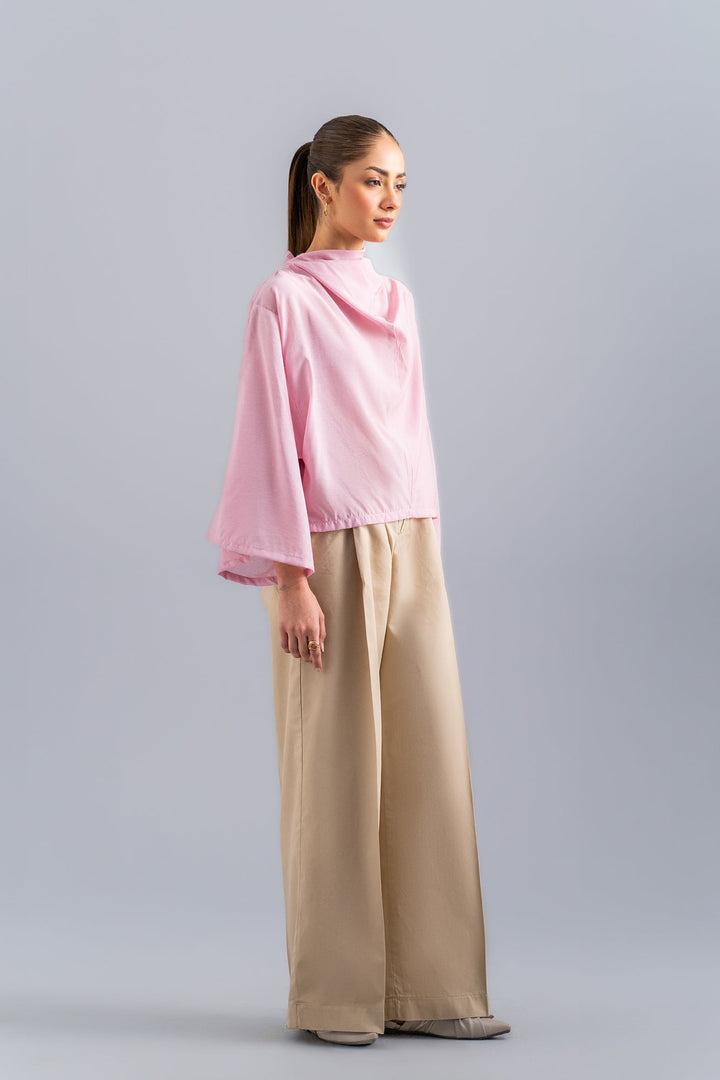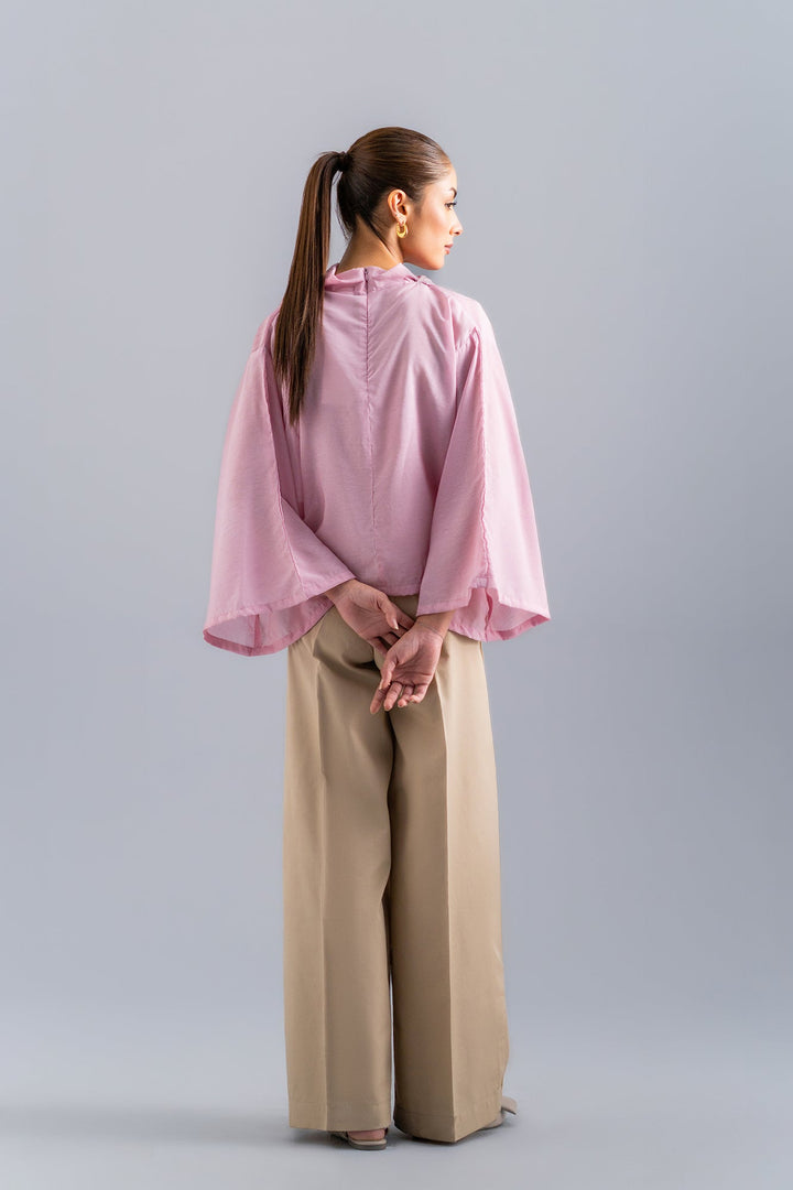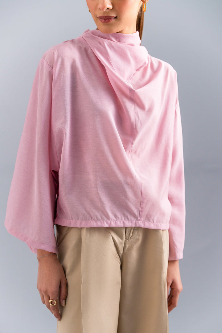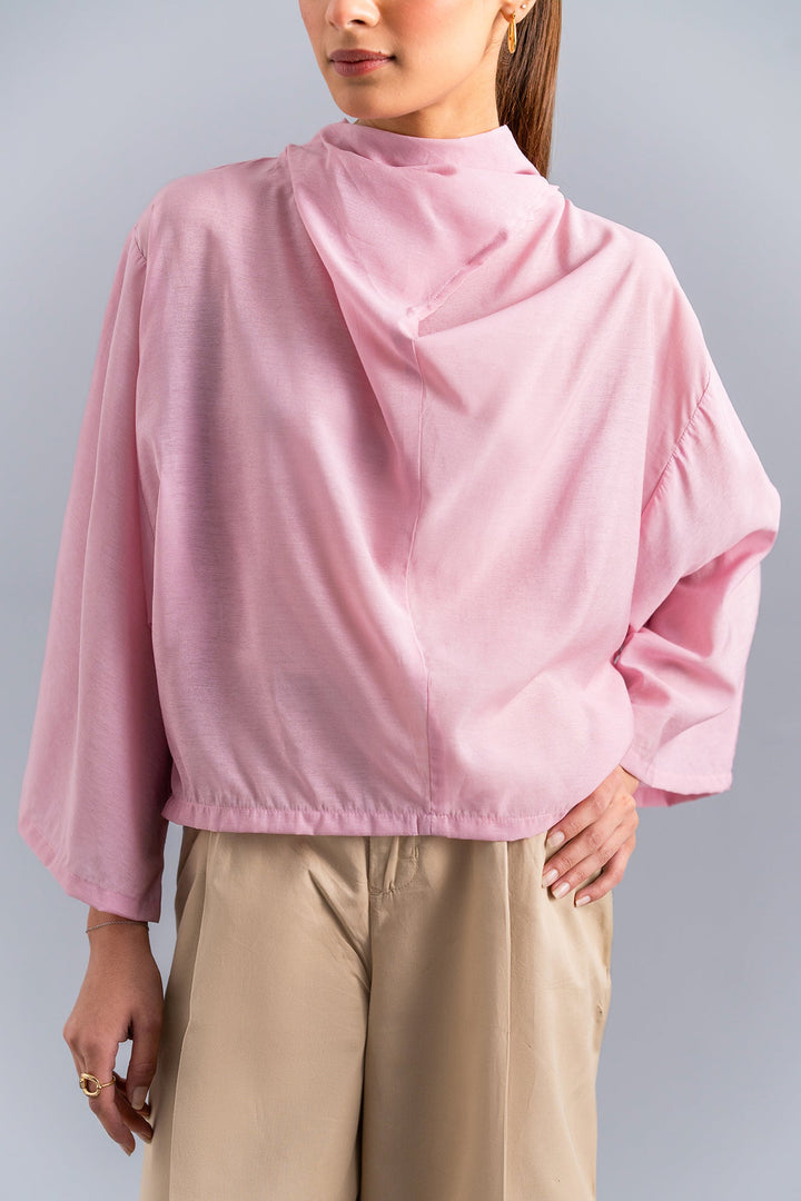 A loose-fitting, light pink top with a flowing silhouette with gathers at front and a high neckline. The top has a soft, draping effect, creating an elegant and relaxed look. It falls just above the waist giving a minimalistic and sophisticated vibe.