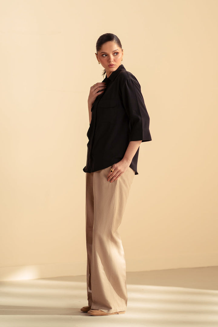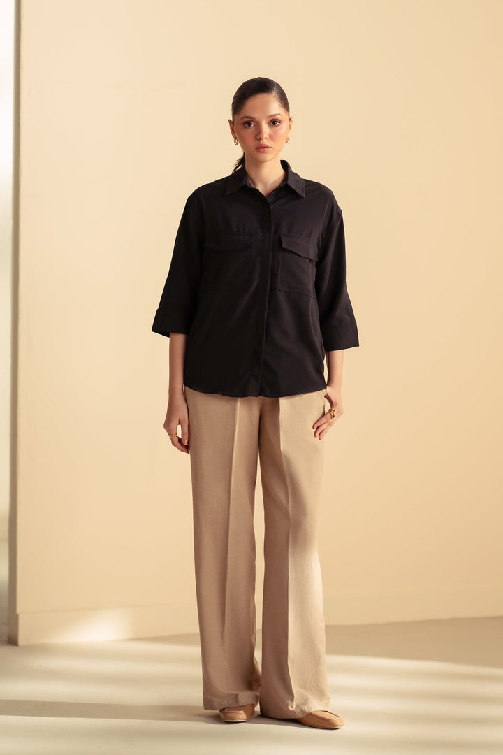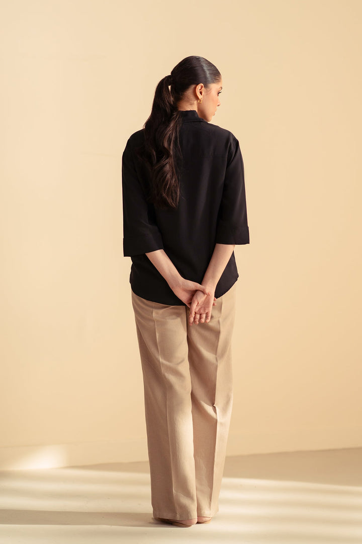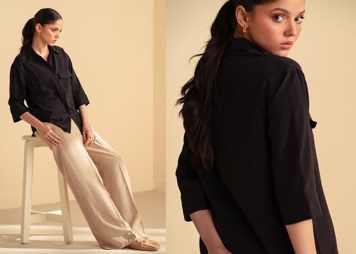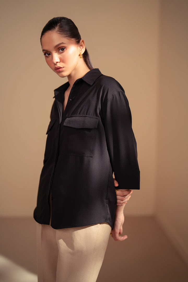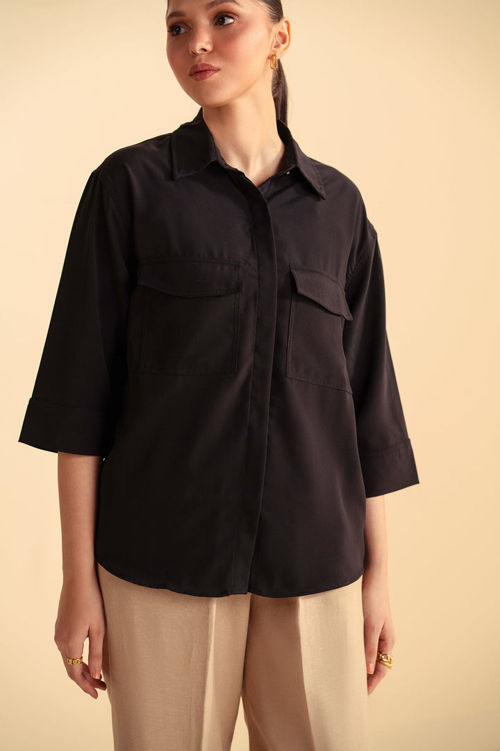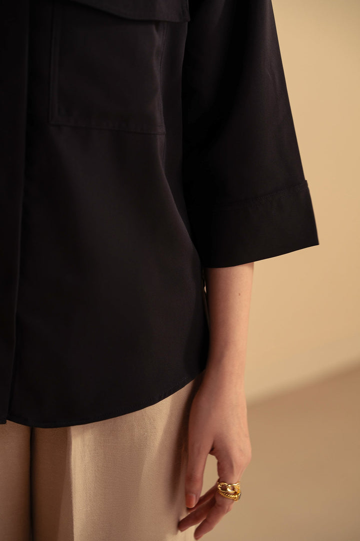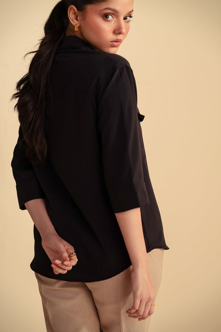 A classy yet elegant design is portrayed on this contemporary button down shirt rendered in a charming deep black shade. Crafted in an experimental silhouette with collar neck, quarter sleeves and flap pockets at front, this trendy shirt is a great option for fun gatherings this winter season.