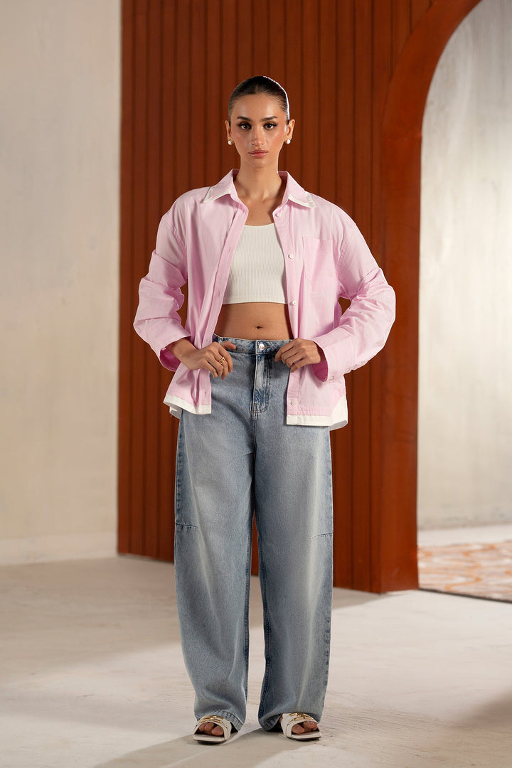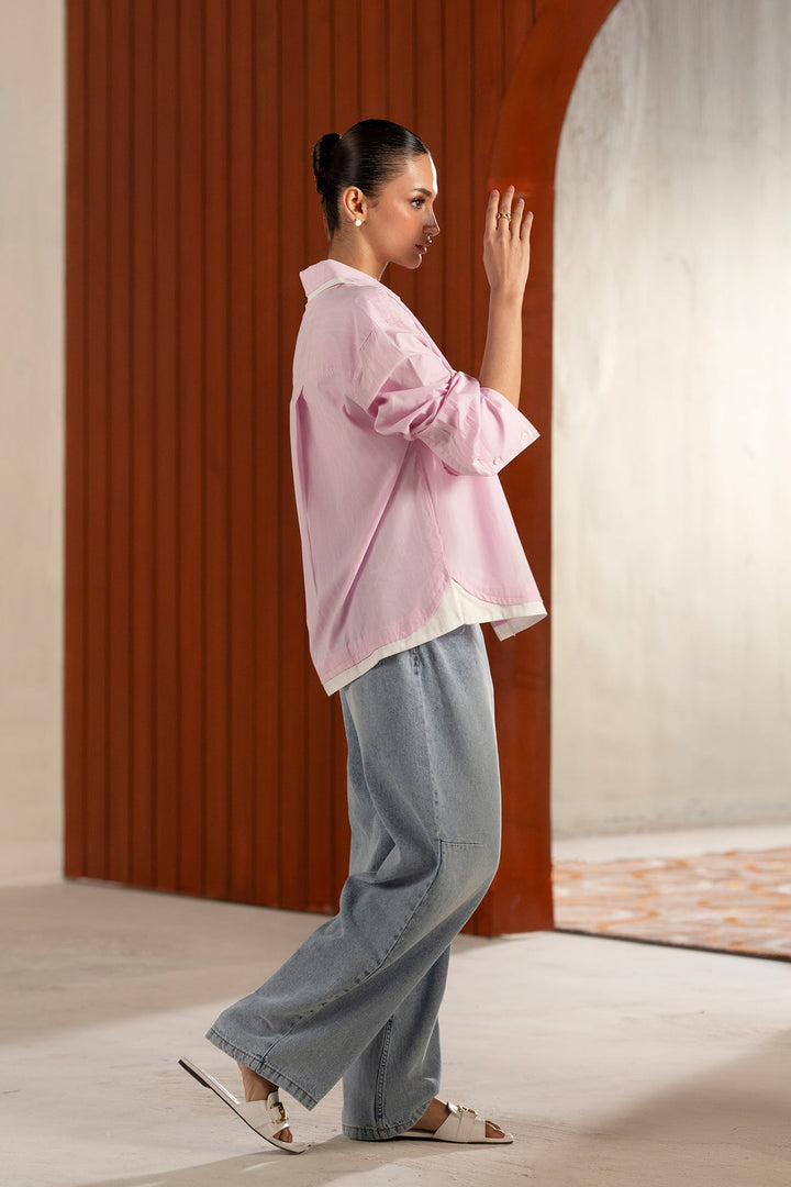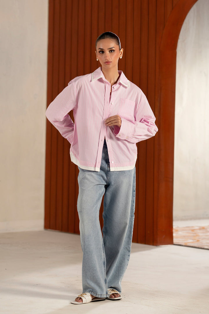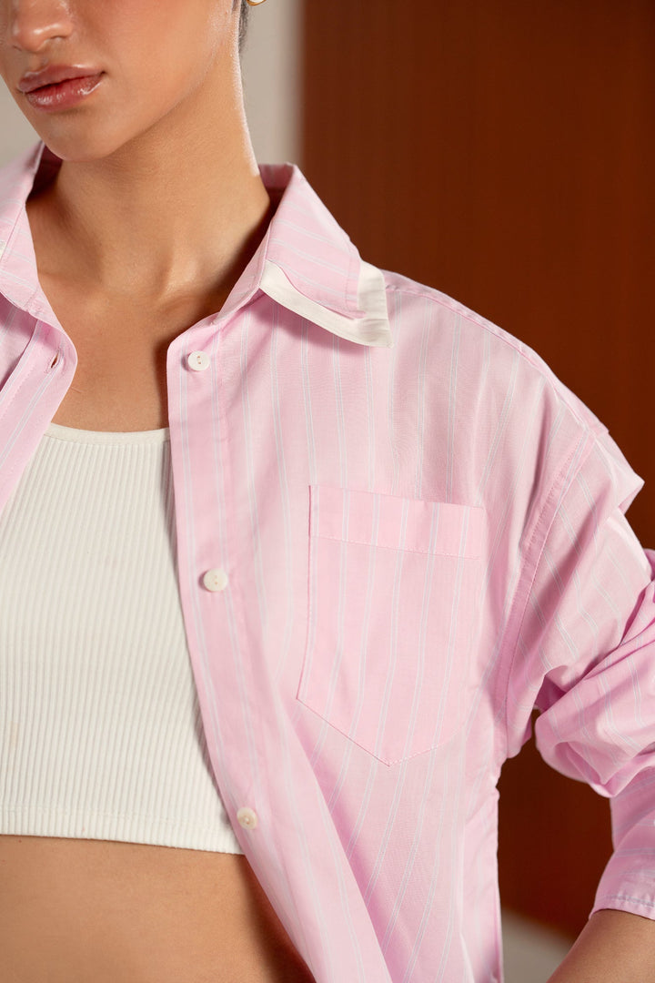 A trendy composition is portrayed on this contemporary shirt rendered in a mesmerizing ice pink color. Crafted in a chic button down silhouette illustrating a classy design adorned with stripes in contrasted white hues. This contemporary shirt is a perfect option to style at fun occasions this season.