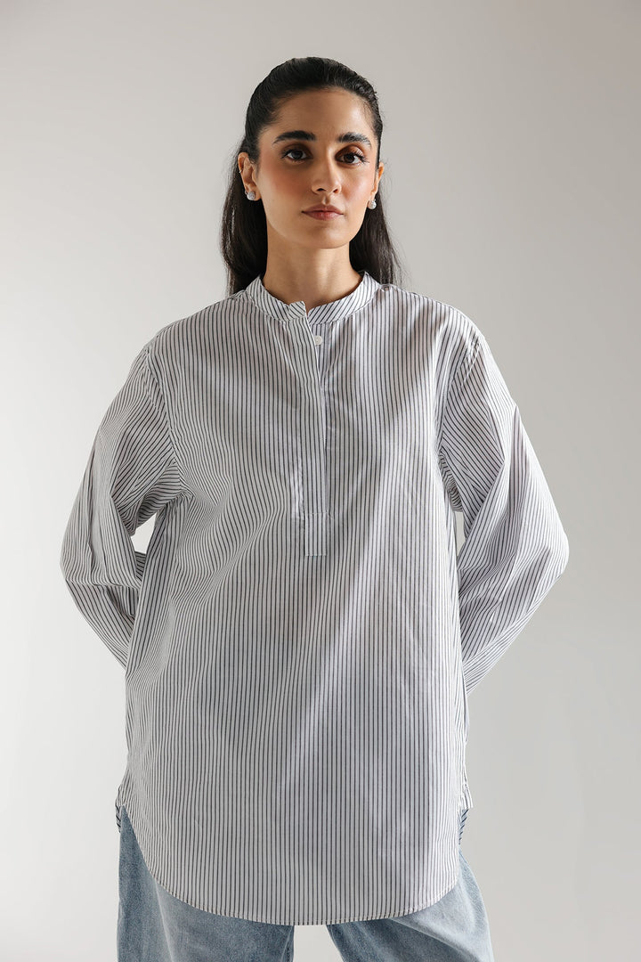 This stylish shirt features a bold composition, with classy white stripes. Its chic silhouette is complemented by trendy ban neck and round opening, making it a fashionable option for summer gatherings.