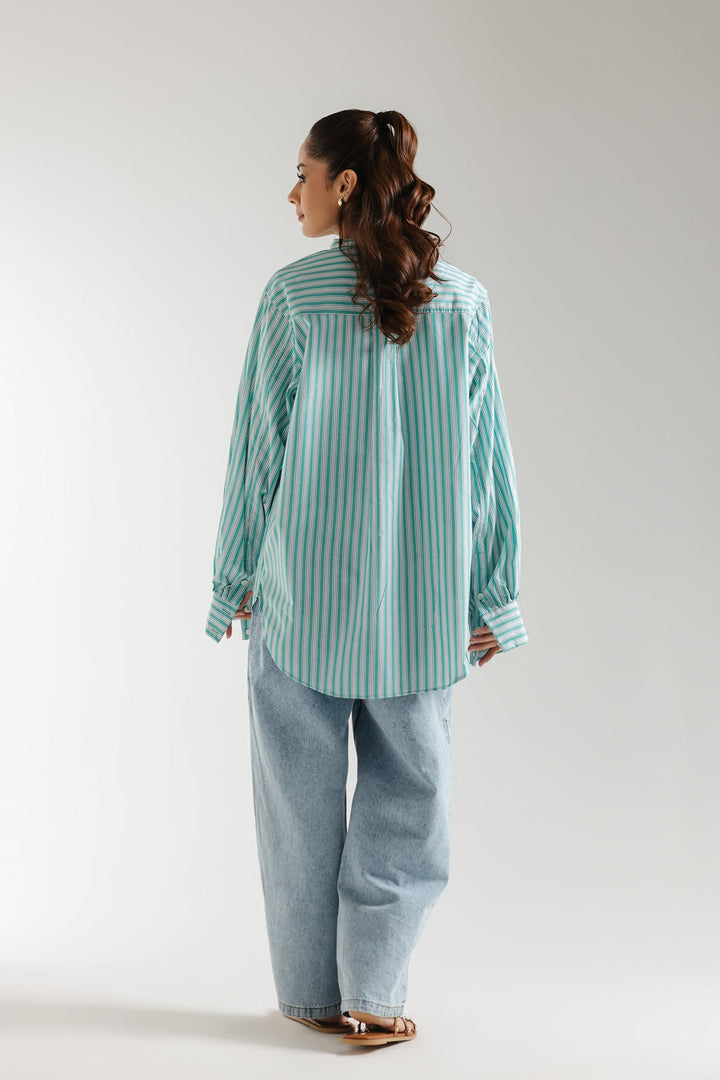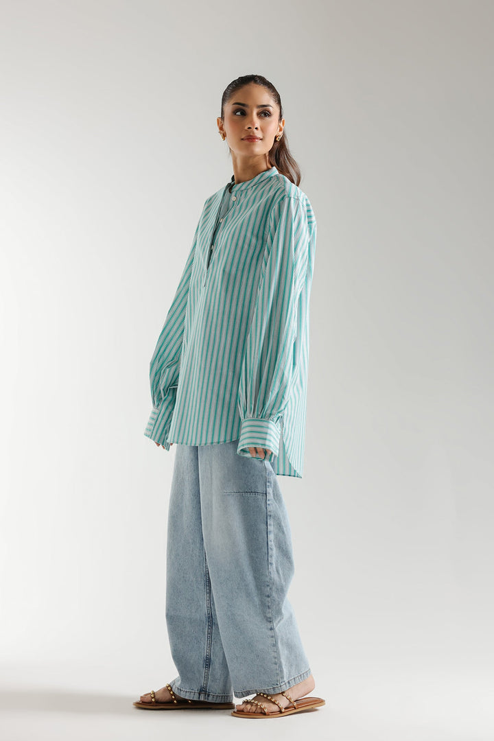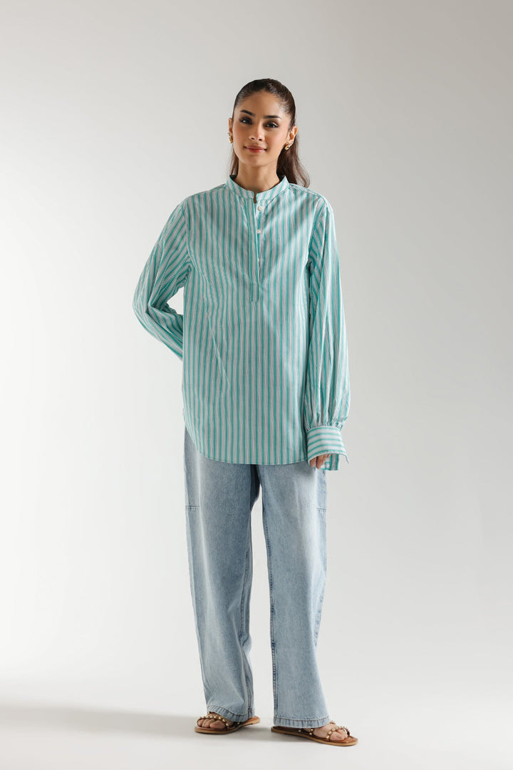 This stylish shirt features a bold composition, with a classy light green color and contrasting white stripes. Its chic silhouette is complemented by trendy ban neck and round opening, making it a fashionable option for summer gatherings.