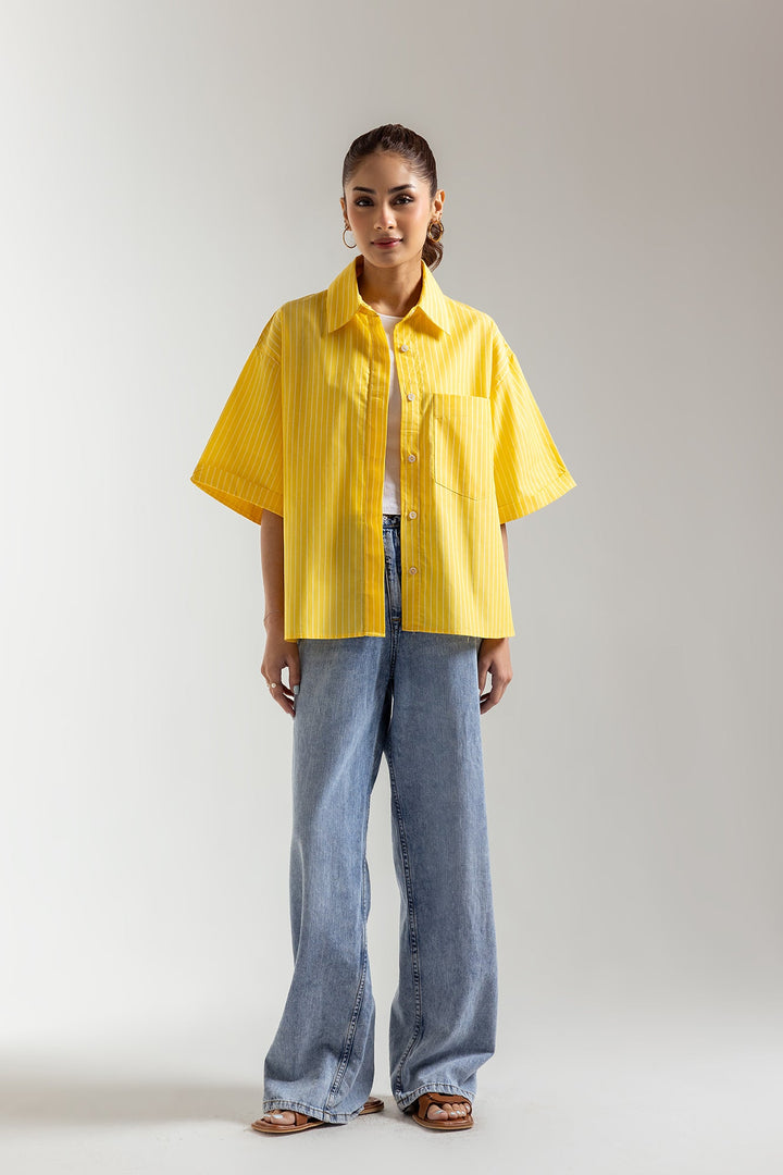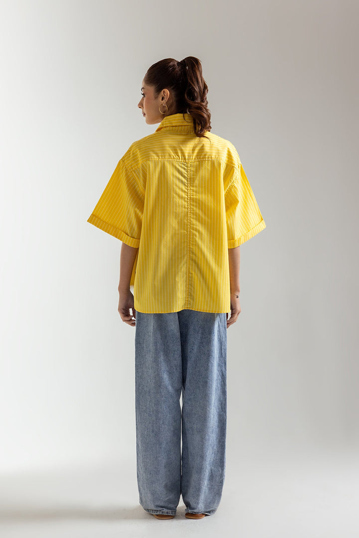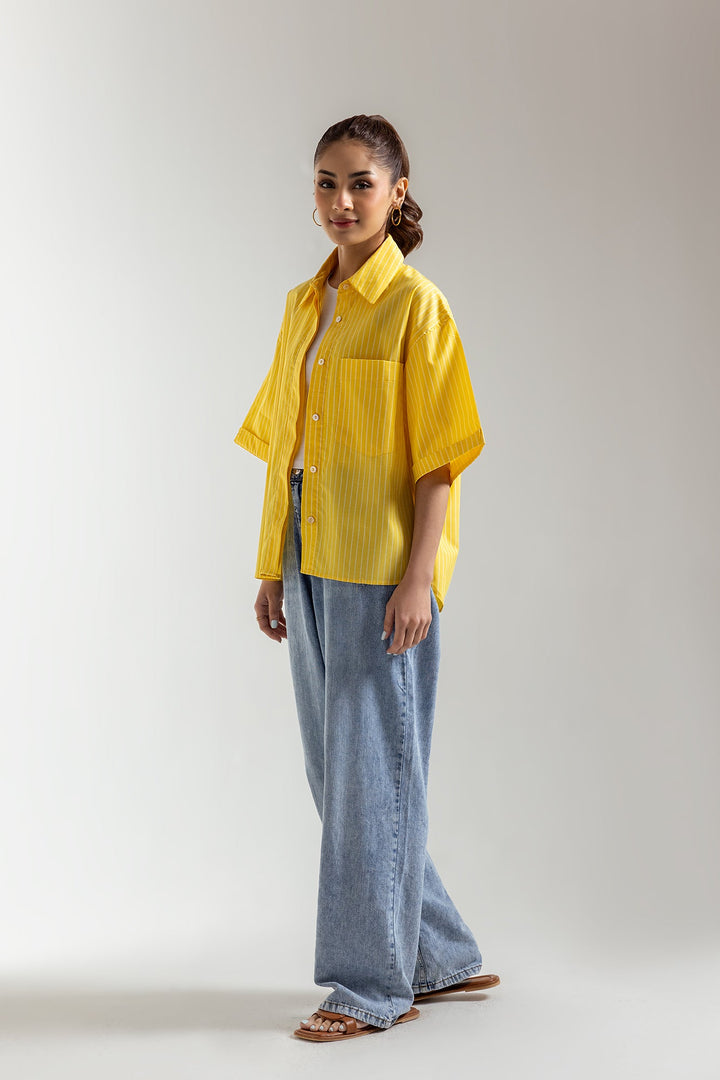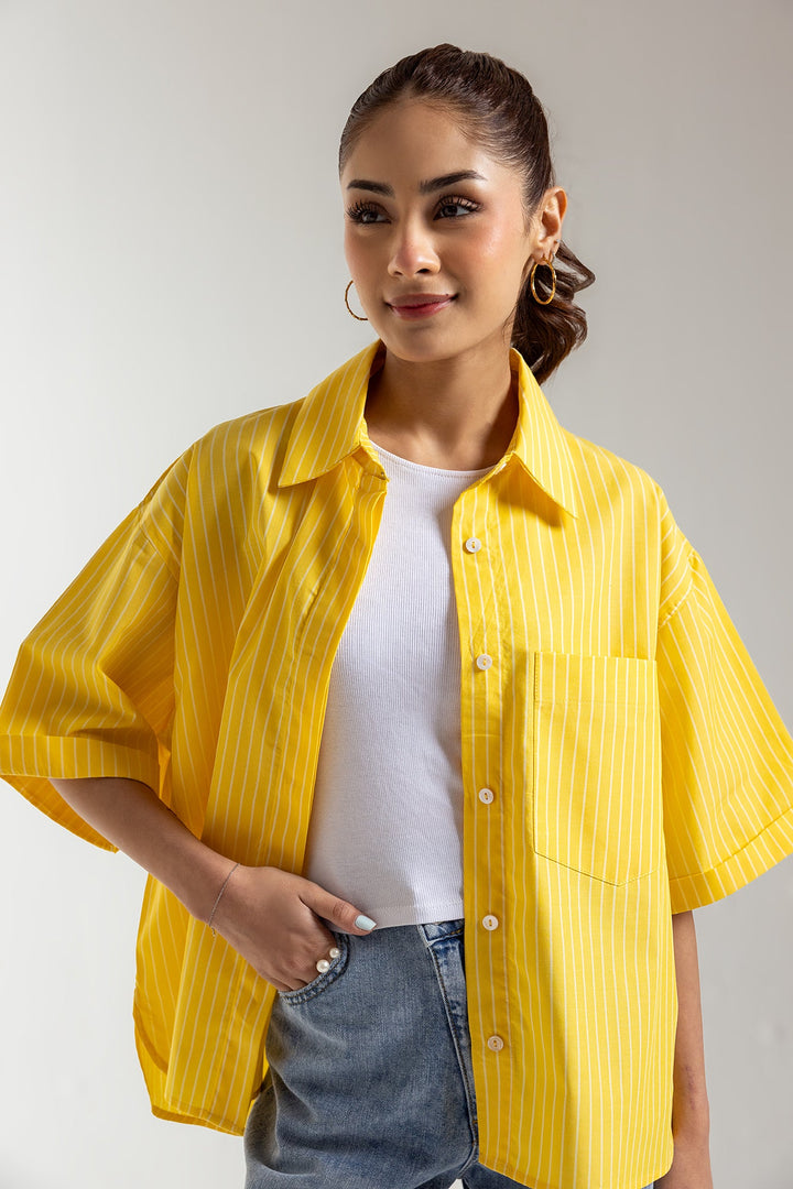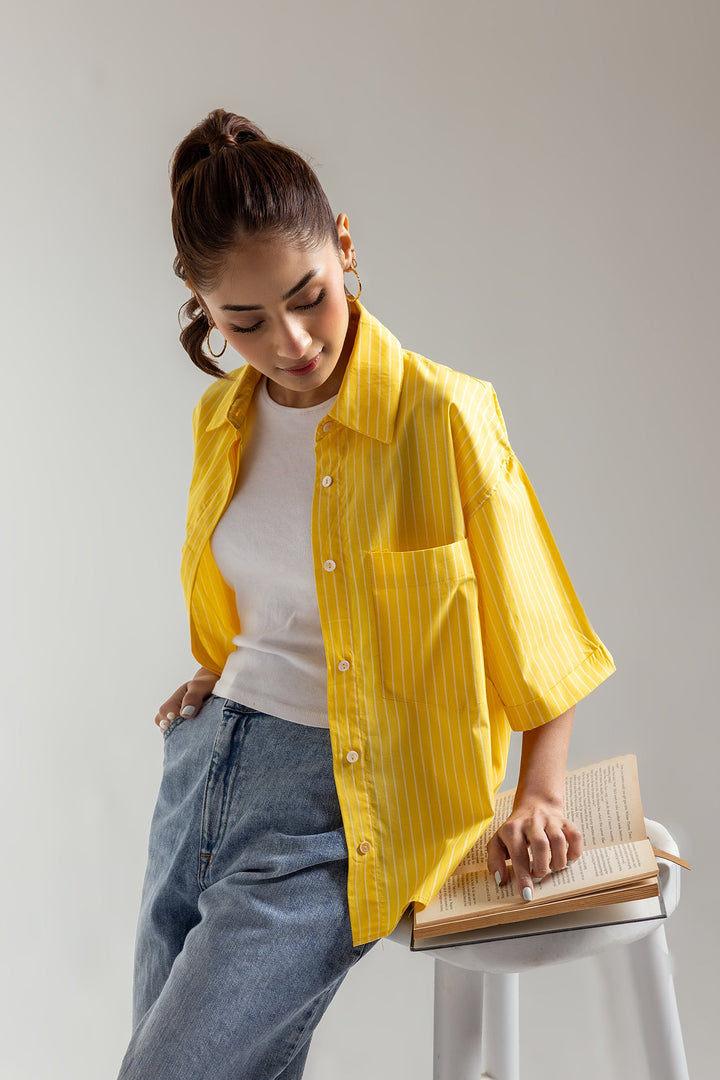 This trendy shirt features a stunning aesthetically-rich design in a gleaming bright yellow color, complete with a chic button-down silhouette. The classy striped pattern in contrasting purple hues that adds a touch of sophistication to this contemporary piece, making it the perfect choice for fun occasions this season.