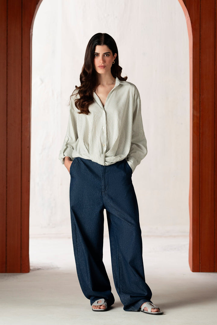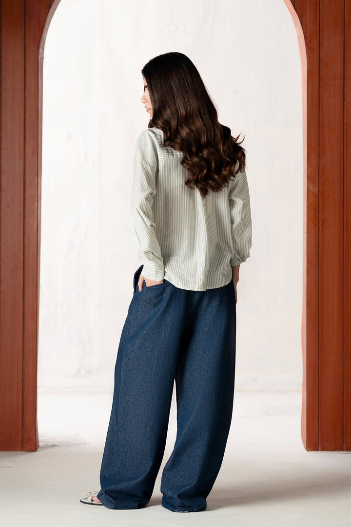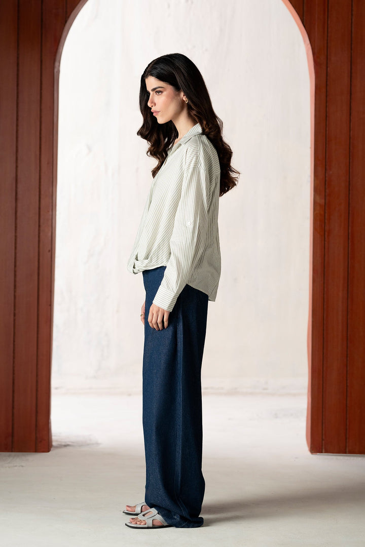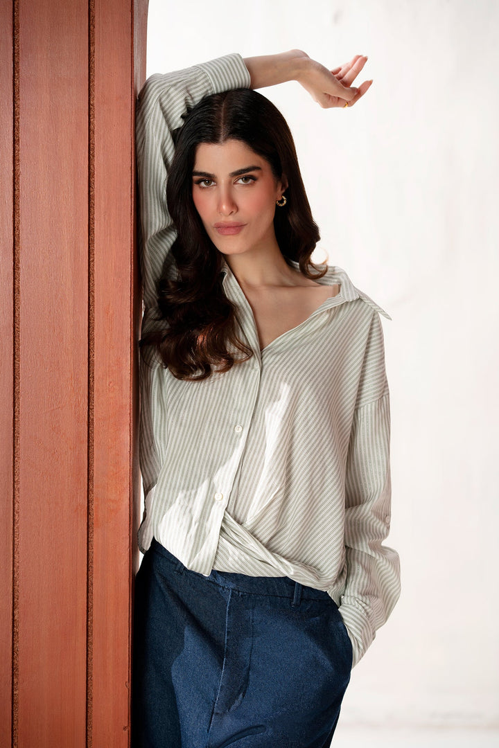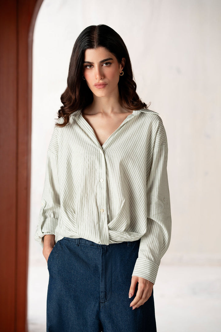 An aesthetically rich composition is portrayed on this trendy shirt rendered in a dull green color and enhanced with stripes. Crafted in a chic button down silhouette with knot tie at front bottom. This contemporary shirt is a perfect option to style at fun occasions this season.