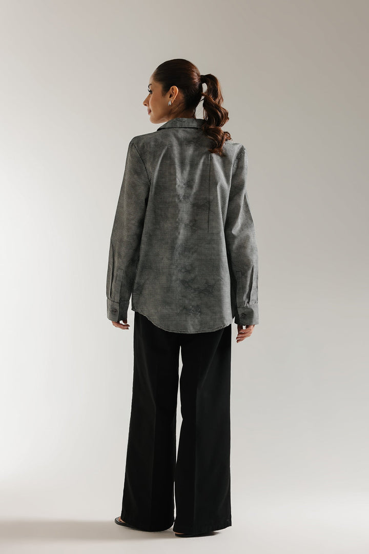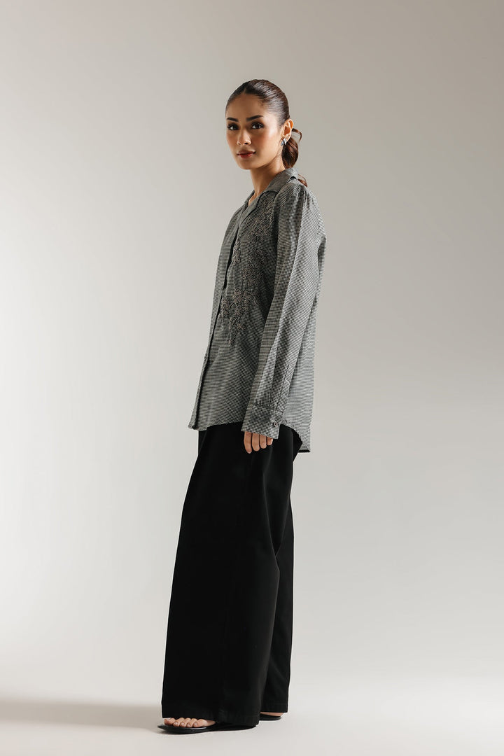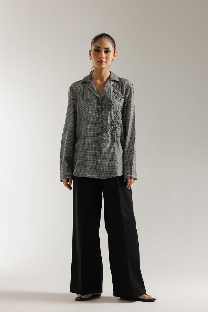 Elevate your classic style with this sophisticated monochrome button-down shirt, where classic tailoring meets elevated detail. The shirt features a structured silhouette with a sharp collar and full-length sleeves, offering a timeless look that instantly lends an air of understated chic and subtle texture. Its true allure lies in the delicate, textured bead embellishment that cascades across the shoulder and chest, adding a unique and artistic flair. This versatile piece seamlessly transitions from workwear chic to evening refinement when paired with tailored trousers or a sleek skirt.