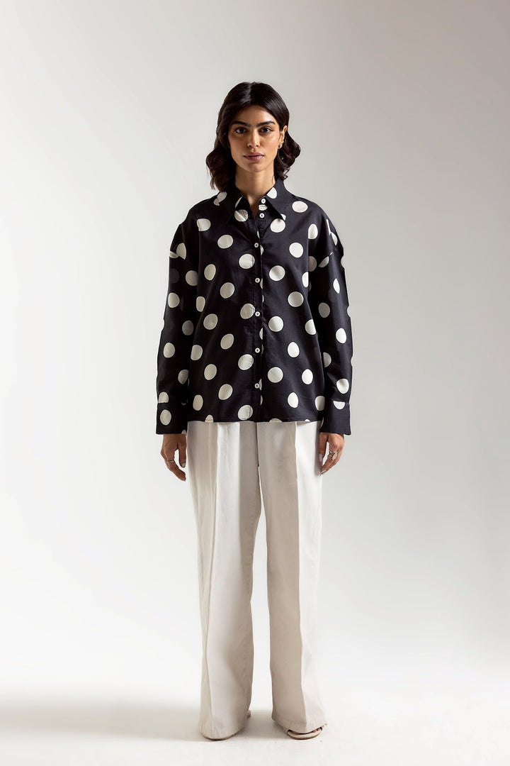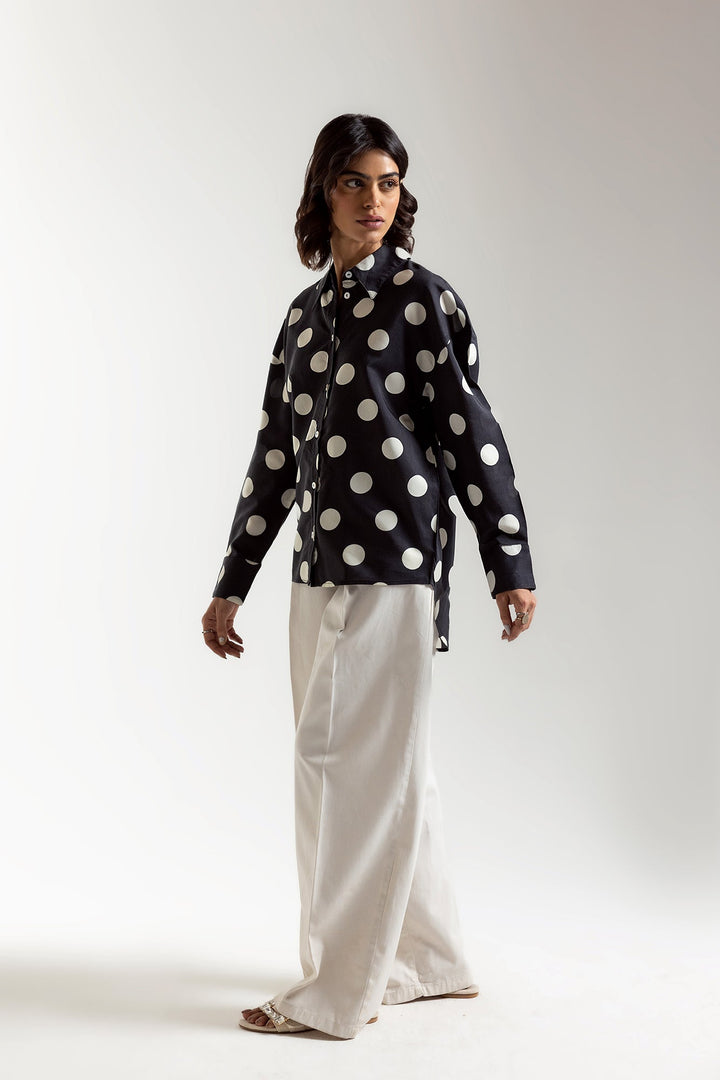 Make a style statement with this contemporary shirt. The classy white color and contrasting black polka dots add a trendy touch. The chic button down silhouette with drop shoulders make this shirt perfect for fun occasions this summer. Elevate your wardrobe with this must-have piece.
