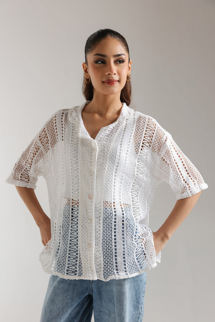 An aesthetically rich composition is portrayed on this trendy shirt rendered in a classy white color. Crafted in a chic button down silhouette crafted from crochet fabric illustrating geometric pattern. This contemporary shirt is a perfect option to style at fun occasions this season.