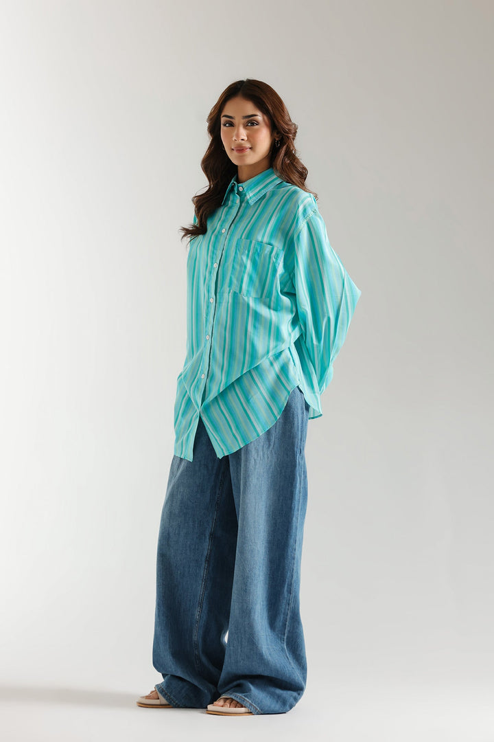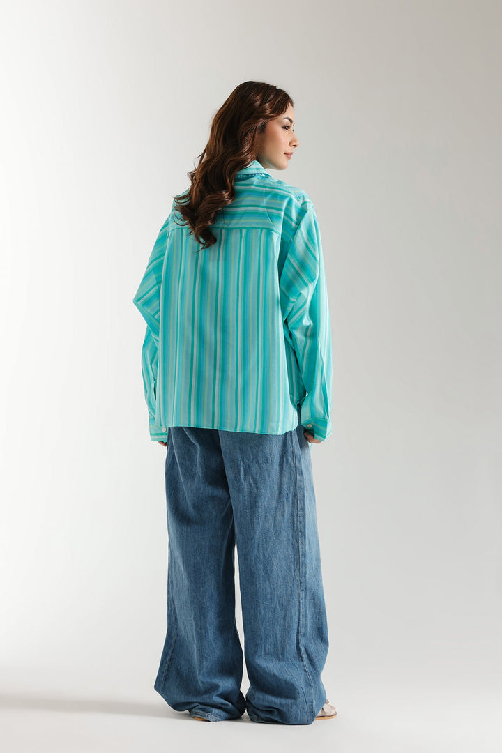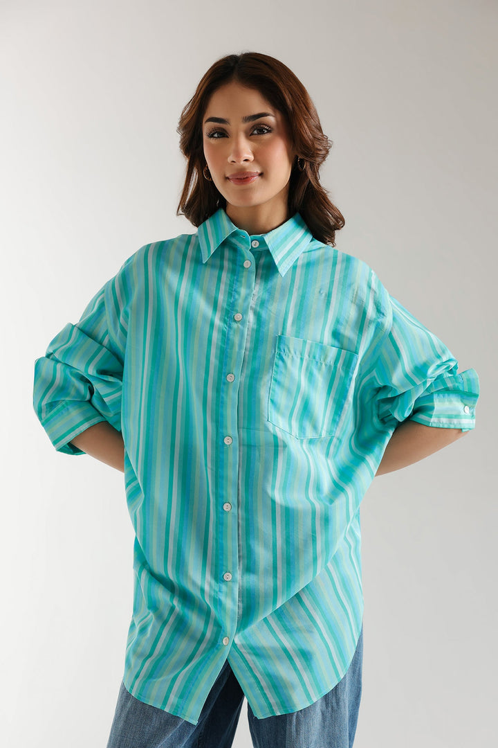 A trendy composition is portrayed on this contemporary shirt rendered in a mesmerizing sea green color. Crafted in a chic button down silhouette illustrating a classy design adorned with stripes in contrasted shades of blue and green hues. This contemporary shirt is a perfect option to style at fun occasions this season.