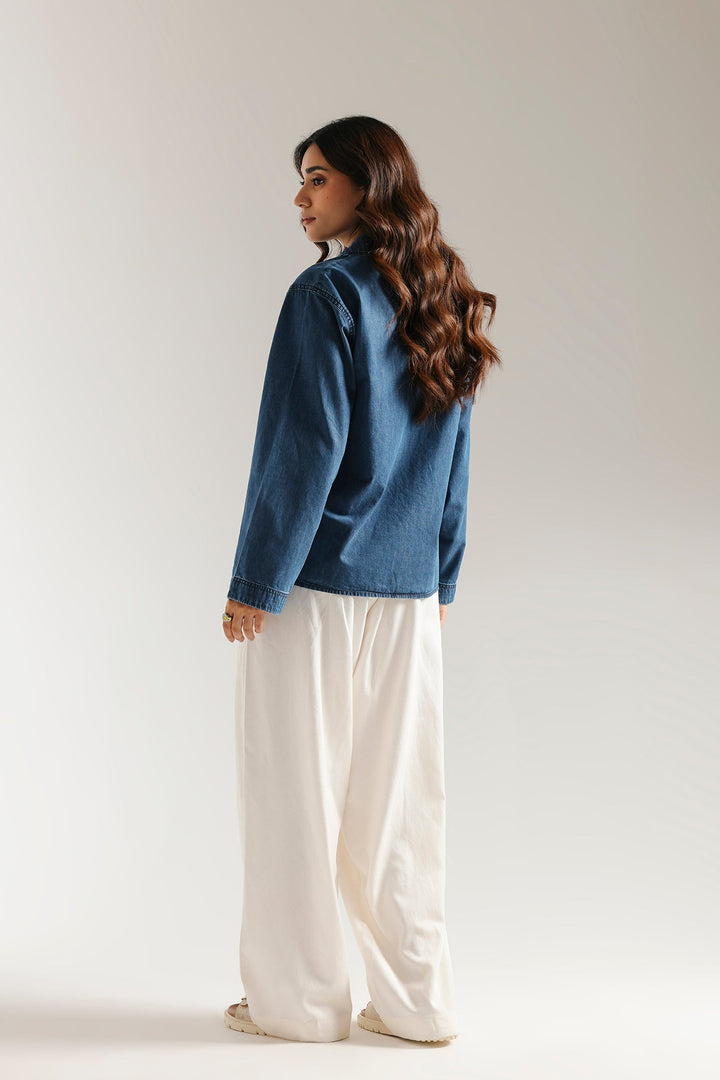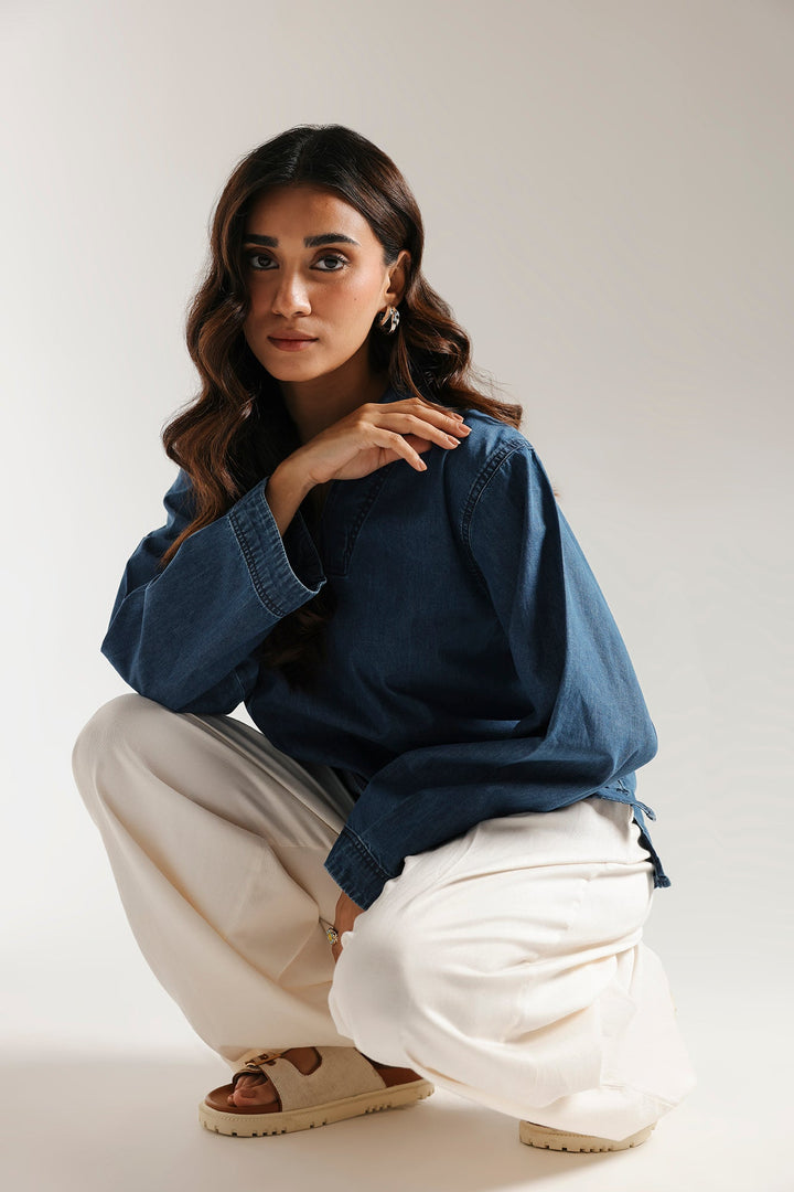 This effortlessly stylish top offers a fresh take on classic denim. The relaxed, boxy fit and wide sleeves provide ultimate comfort, while the clean V-neckline adds a touch of modern sophistication. Its versatile design makes it a perfect piece to pair with wide-leg trousers for a chic, contemporary look.