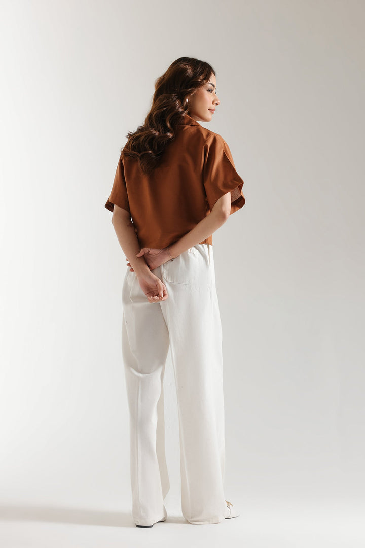 A chic and sassy composition is portrayed on this trendy shirt rendered in a deep brown color. Crafted in a chic button down cropped silhouette illustrating short sleeves. This contemporary shirt is a perfect option to style at fun occasions this season.