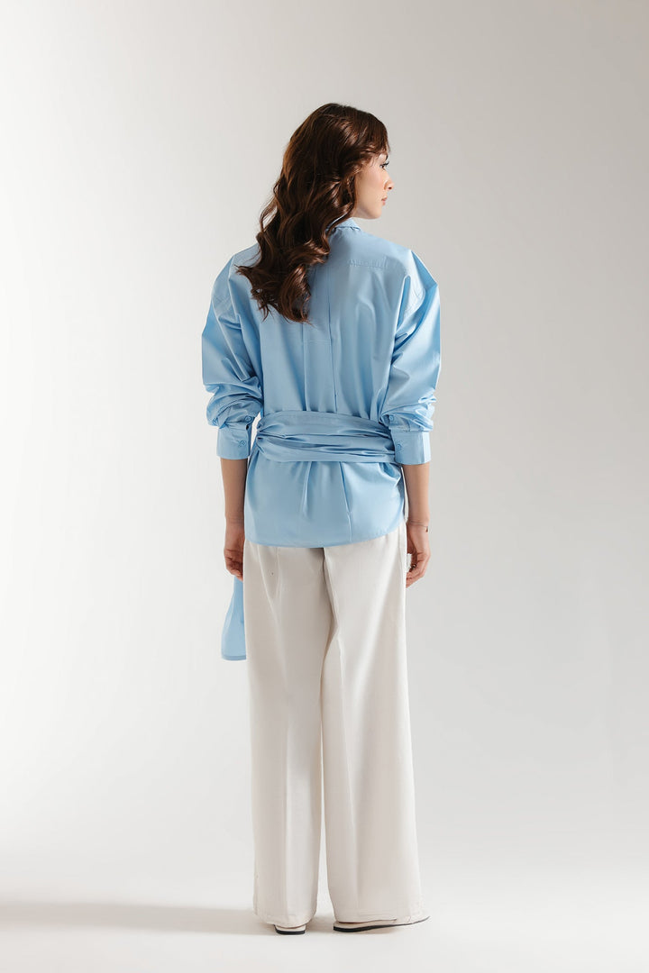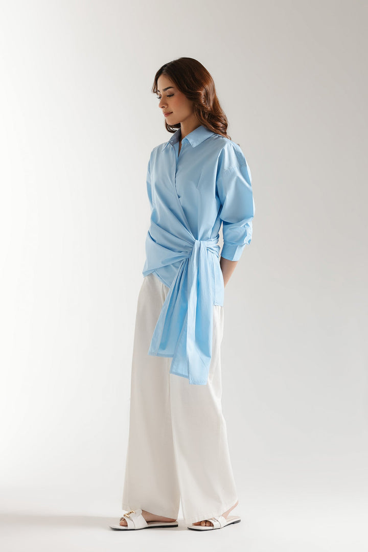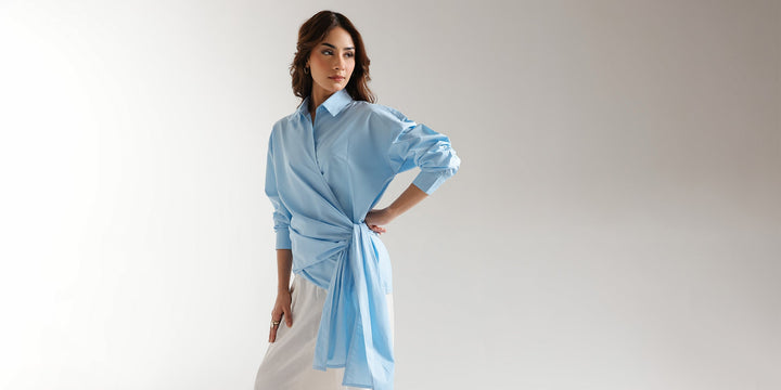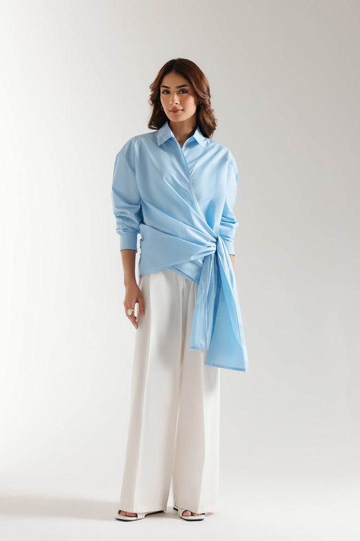 This sophisticated shirt features a stunning design in a refreshing light blue hue. It is expertly crafted in a stylish silhouette with overlapped hem and knot tie at front bottom. Perfect for special events this summer season.