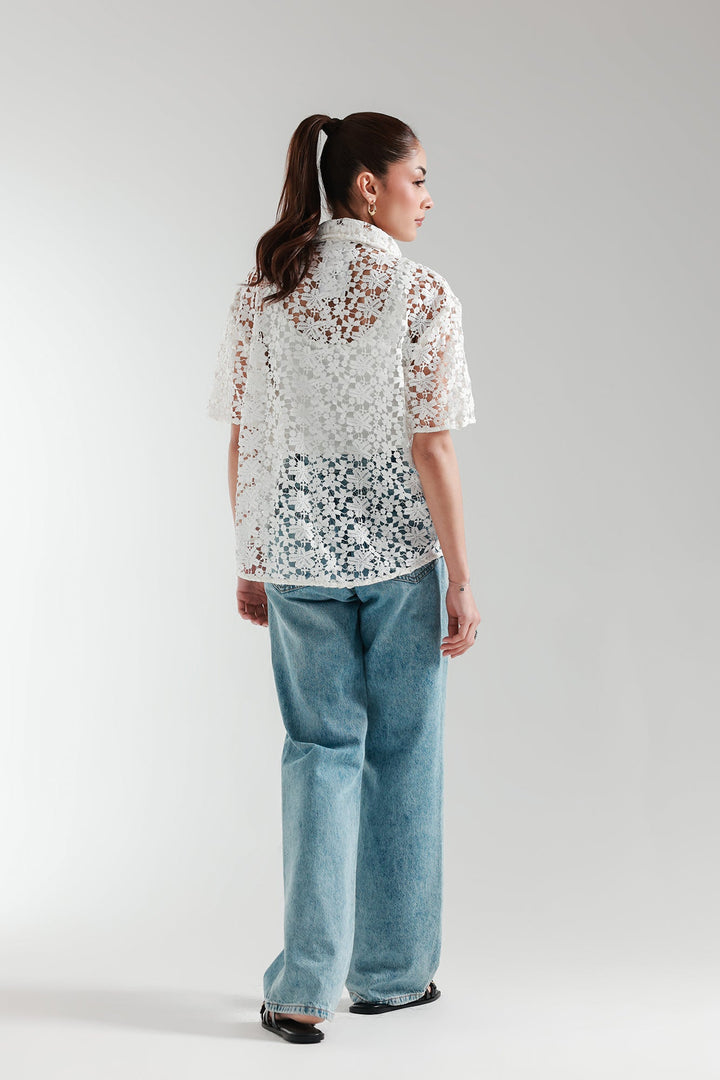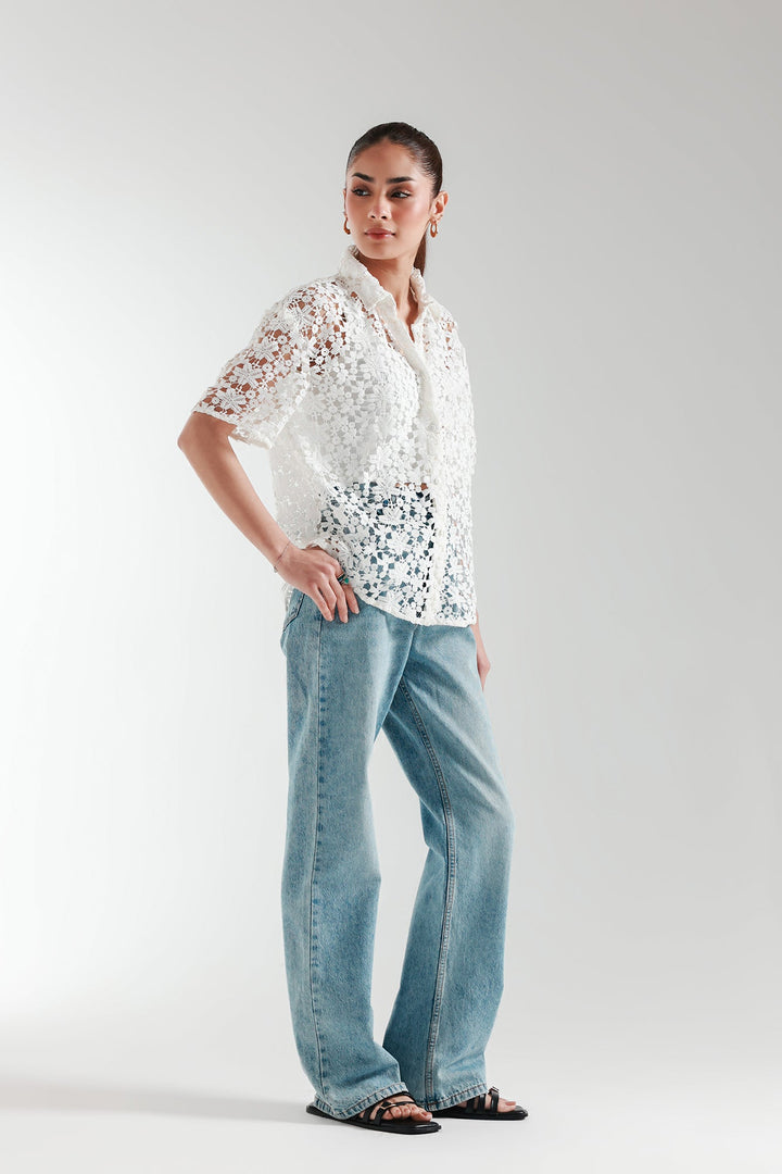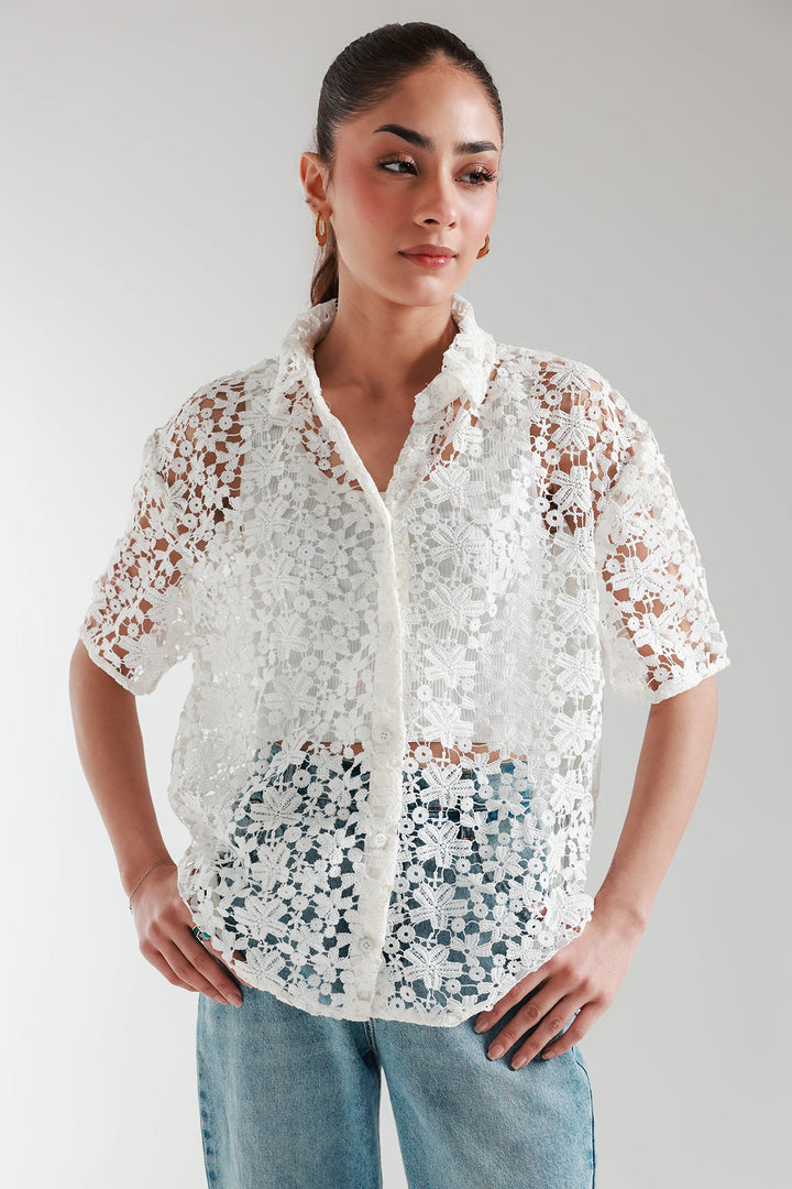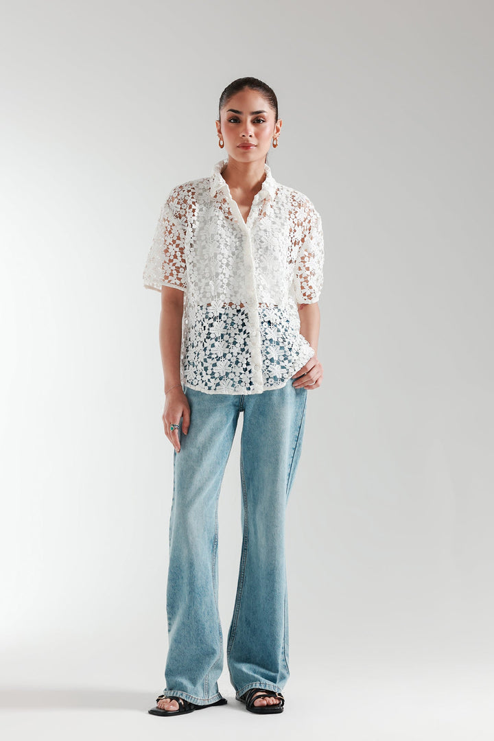 A gracefully elegant top crafted in a contemporary loose fit button down silhouette. Illustrating a mesmerizing deep black color and beautifully adorned with cutwork net fabric, this contemporary yet sassy top is a trendy option for fun gatherings this spring season.