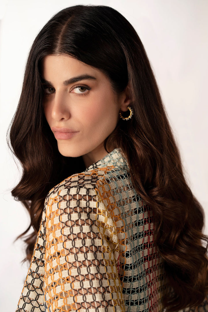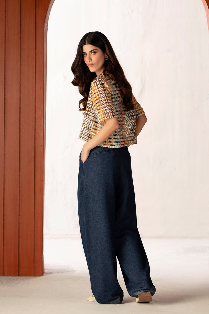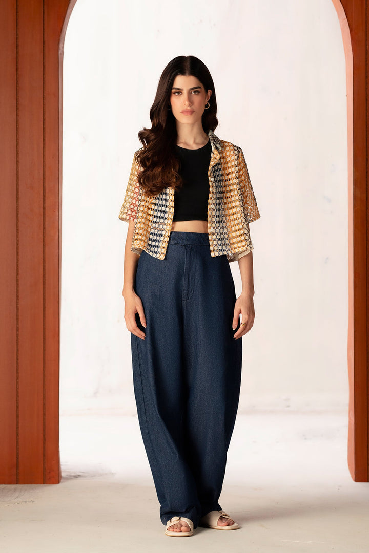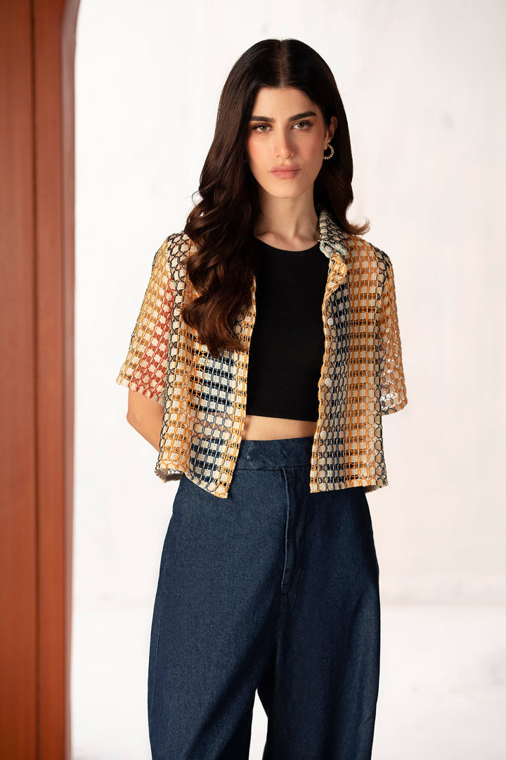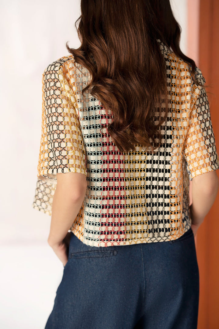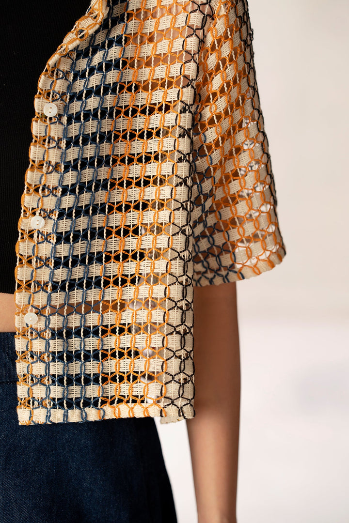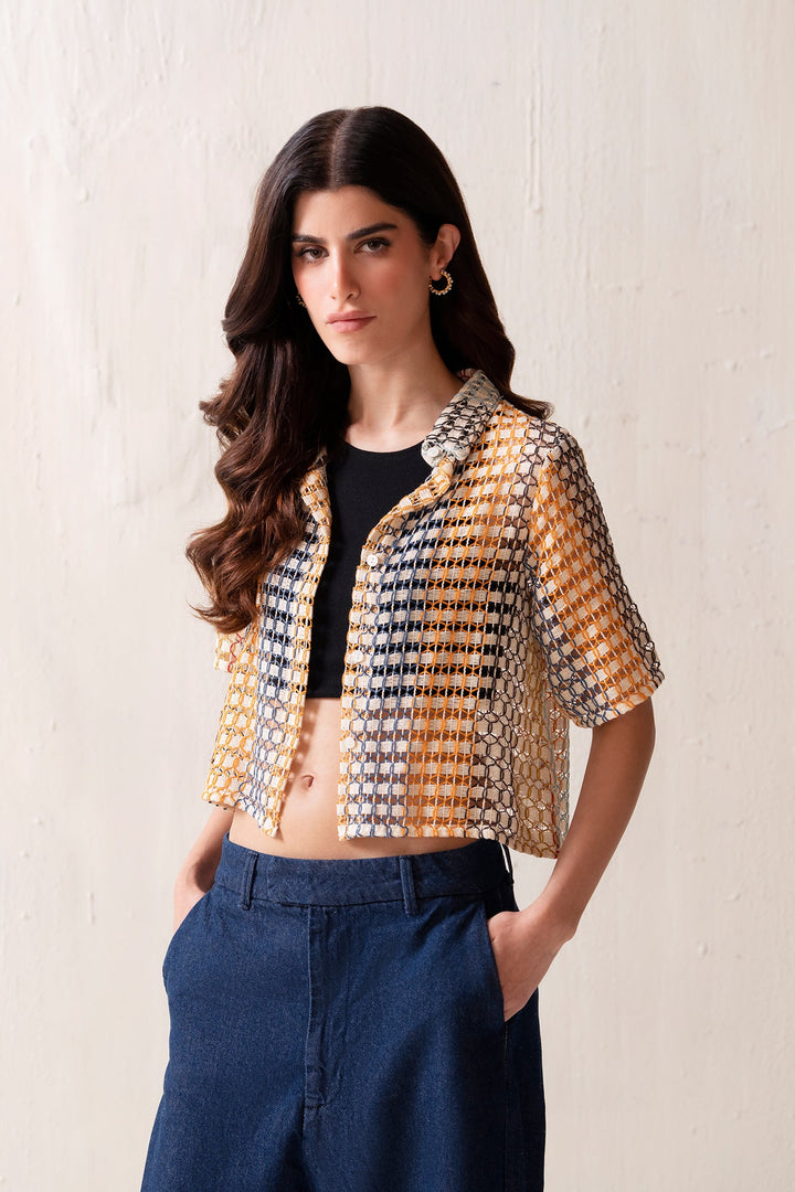 An aesthetically rich composition is portrayed on this trendy shirt rendered in a gleaming mango yellow color. Crafted in a chic button down cropped silhouette crafted from crochet fabric illustrating geometric pattern. This contemporary shirt is a perfect option to style at fun occasions this season.