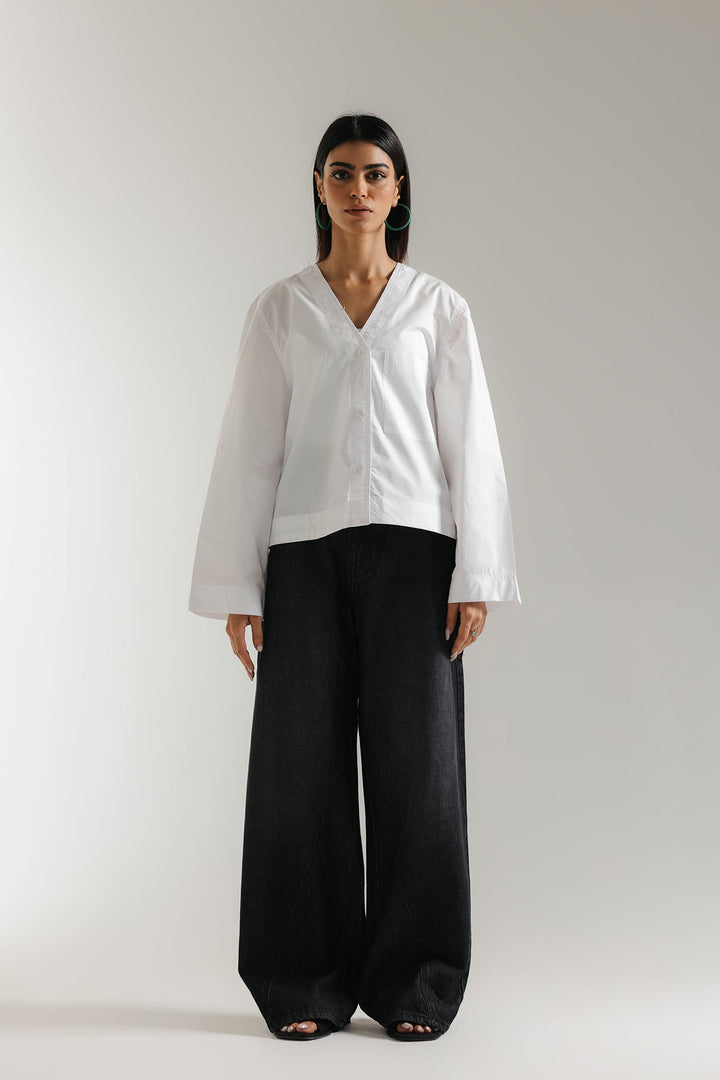 Elevate your wardrobe with this effortlessly chic white button-down shirt. Crafted from a crisp, lightweight fabric, this shirt features a relaxed fit silhouette and a flattering V-neckline with front placket. The long, wide sleeves add to the modern, airy feel. Perfect for layering or wearing on its own, this versatile shirt can be dressed up for a sophisticated look or paired with casual bottoms for everyday style. A timeless essential for the modern woman.