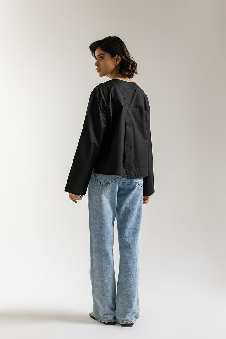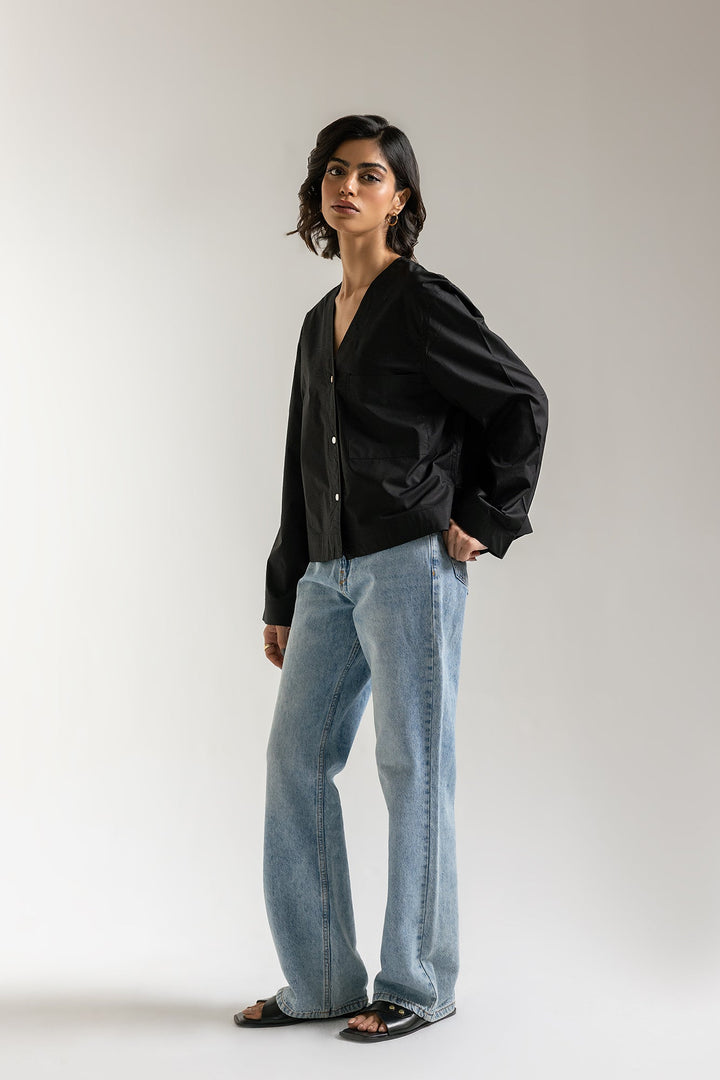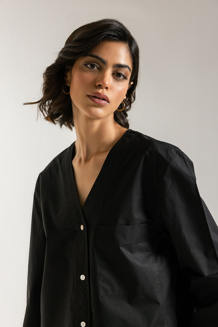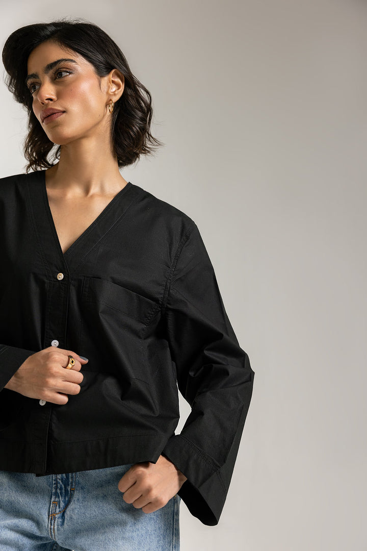 Elevate your wardrobe with this effortlessly chic black button-down shirt. Crafted from a crisp, lightweight fabric, this shirt features a relaxed fit silhouette and a flattering V-neckline with front placket. The long, wide sleeves add to the modern, airy feel. Perfect for layering or wearing on its own, this versatile shirt can be dressed up for a sophisticated look or paired with casual bottoms for everyday style. A timeless essential for the modern woman.