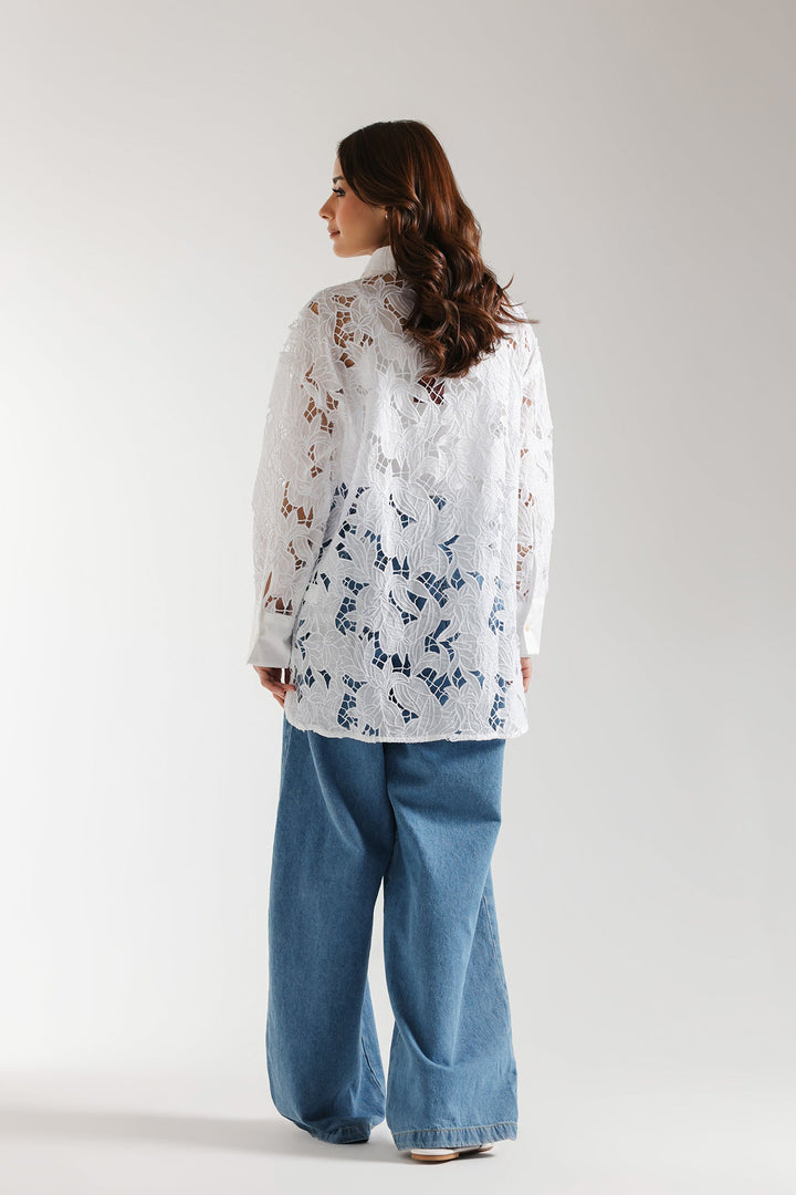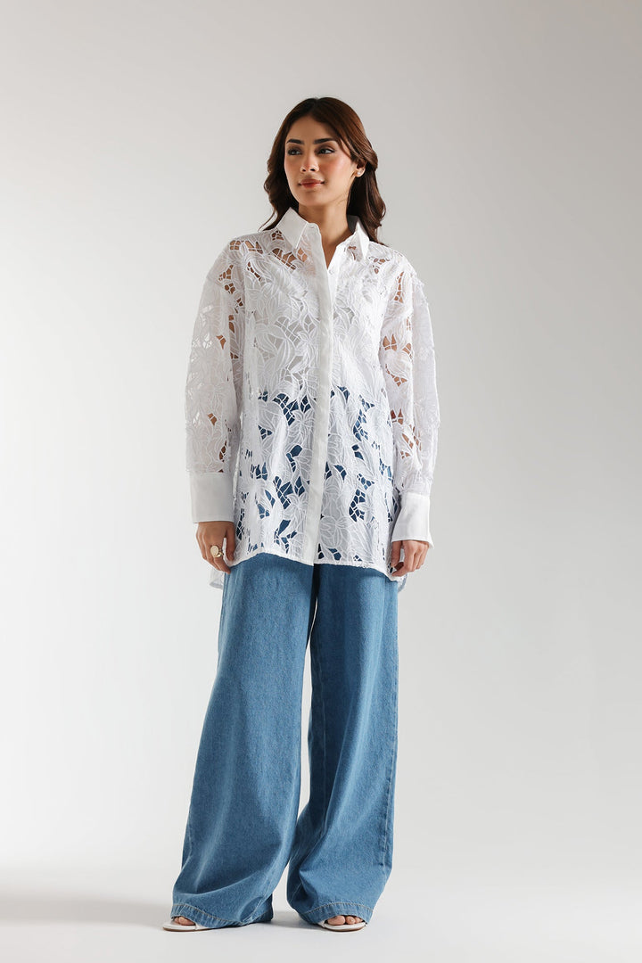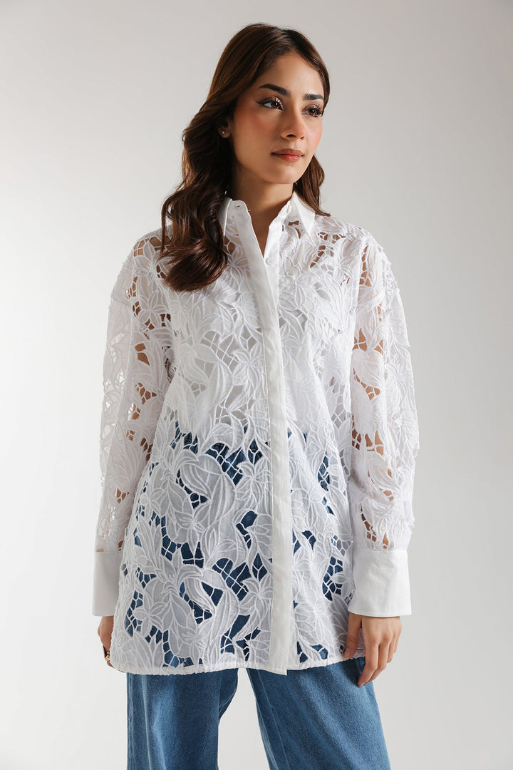 This fashionable shirt boasts an elegant design in a sophisticated white hue. Featuring a stylish button down silhouette crafted from delicate floral embroidered embroidered fabric and enhanced with cutwork details. This modern shirt is ideal for adding some flair to any social event this season.