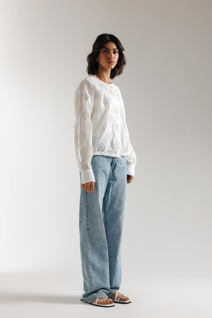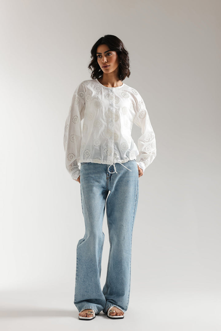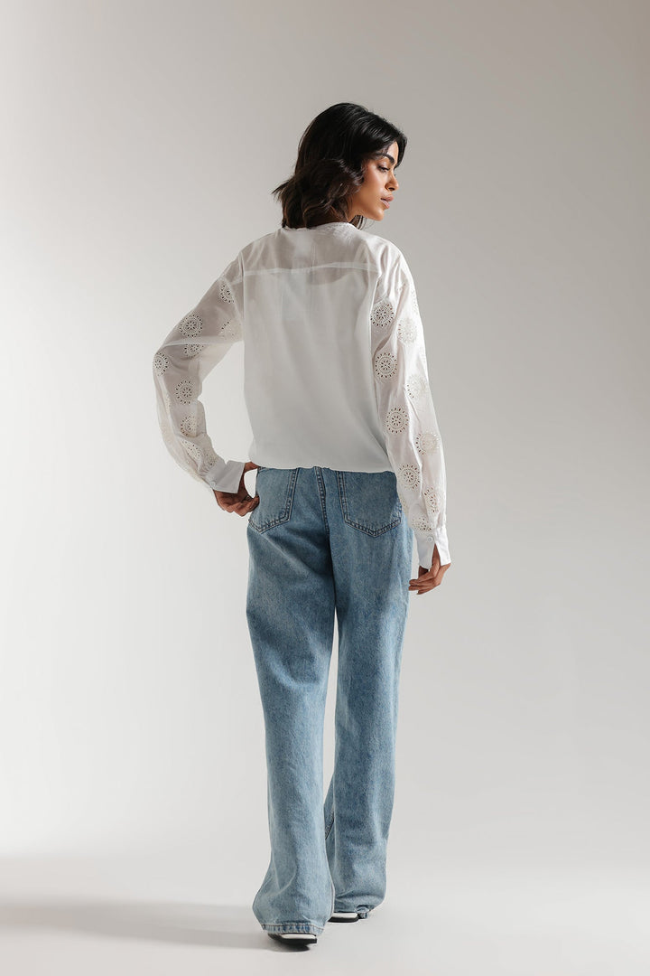 A gracefully elegant shirt crafted in a contemporary loose fit button down silhouette. Illustrating a mesmerizing white color and beautifully adorned with schiffli embroidery, this contemporary yet sassy top is a trendy option for fun gatherings this spring season.