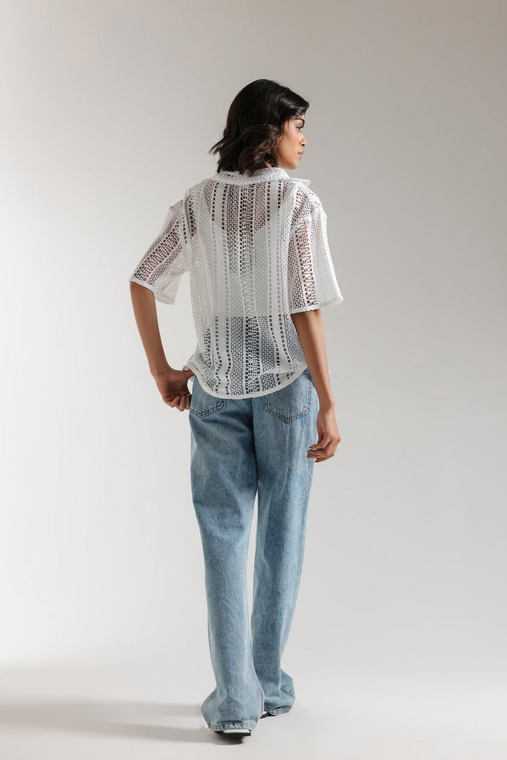 An aesthetically rich composition is portrayed on this trendy shirt rendered in a celestial white color. Crafted in a chic button down silhouette crafted from crochet fabric illustrating geometric pattern. This contemporary shirt is a perfect option to style at fun occasions this season.