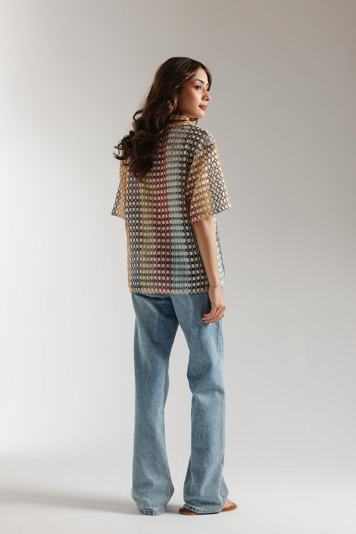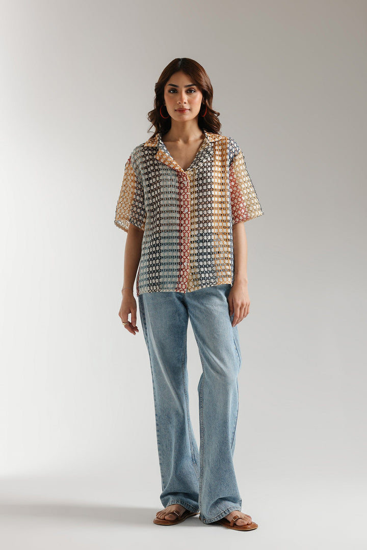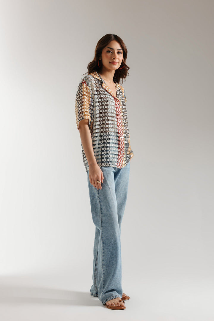 An aesthetically rich composition is portrayed on this trendy shirt rendered in a gleaming mango yellow color. Crafted in a chic button down silhouette crafted from crochet fabric illustrating geometric pattern blended with vibrant colors. This contemporary shirt is a perfect option to style at fun occasions this season.